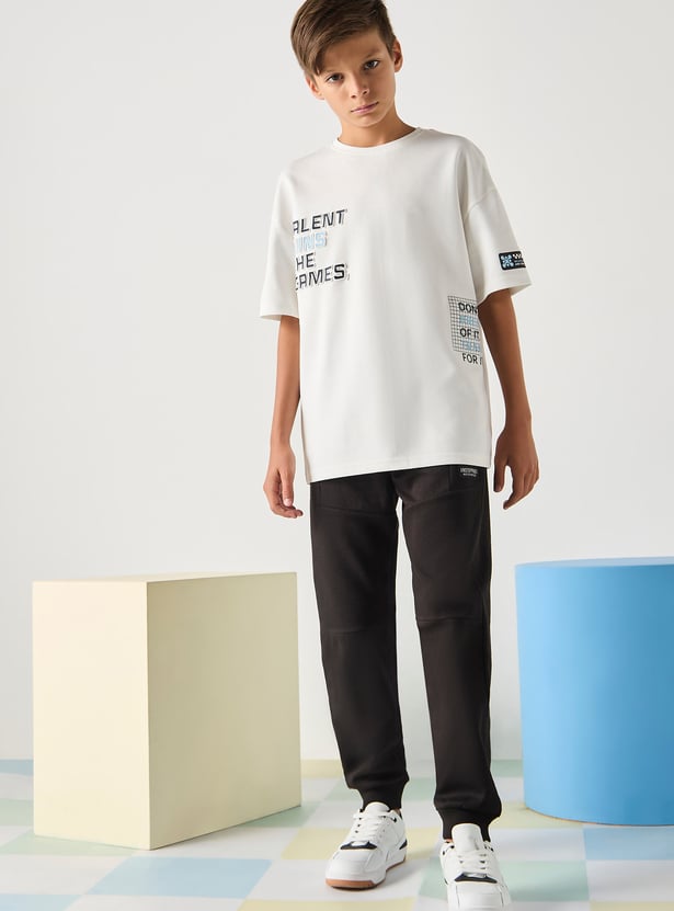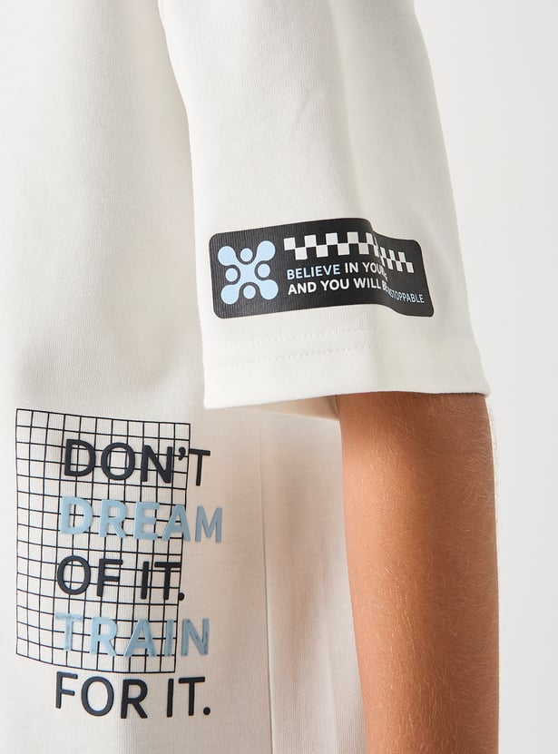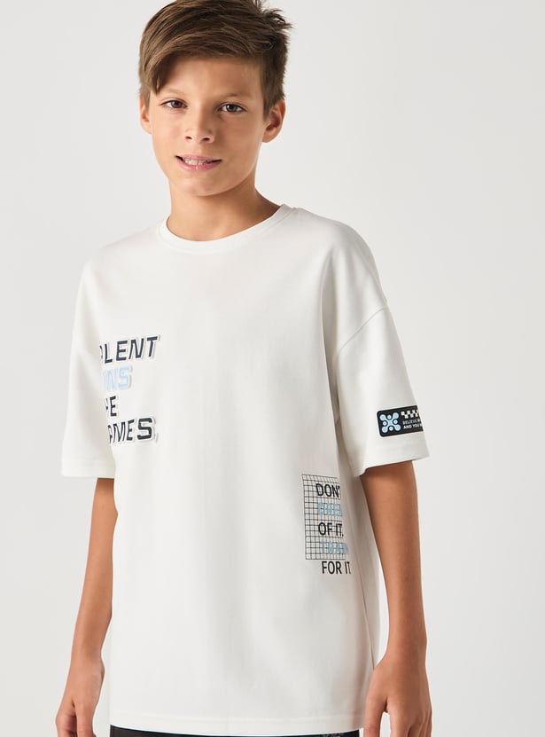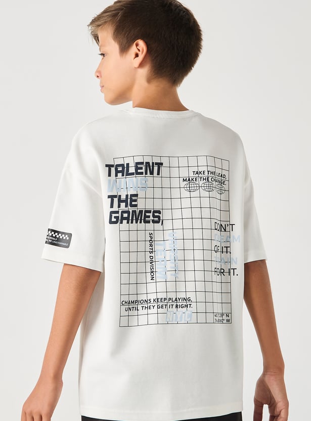 Instantly add a touch of summer and vacation vibes to your kid's casual wardrobe with this T-shirt. It features a back graphic print, a placement print on the front, a crew neck, and half sleeves, making it perfect for laid-back, sunny days.