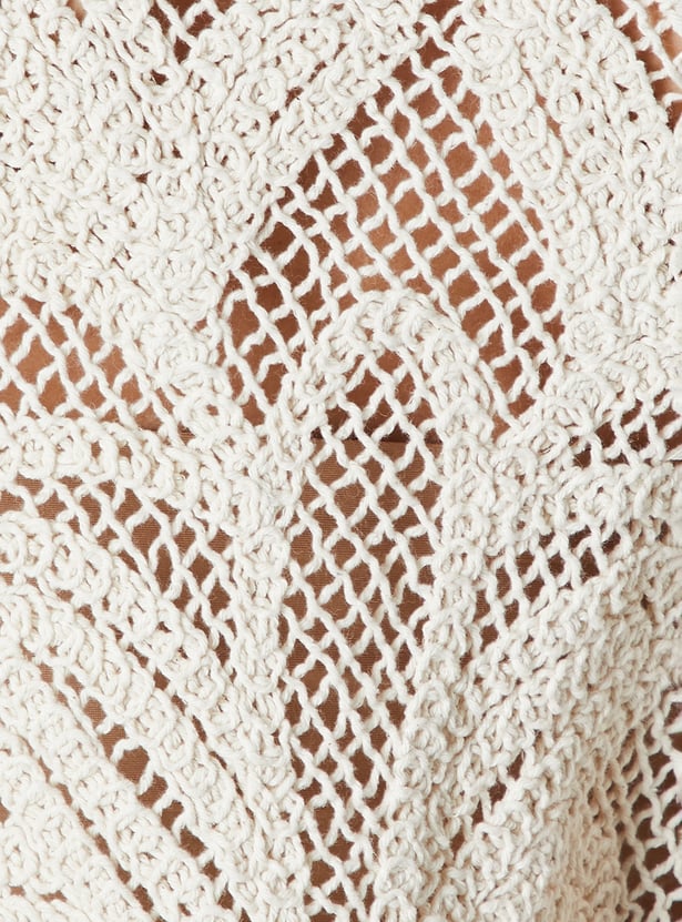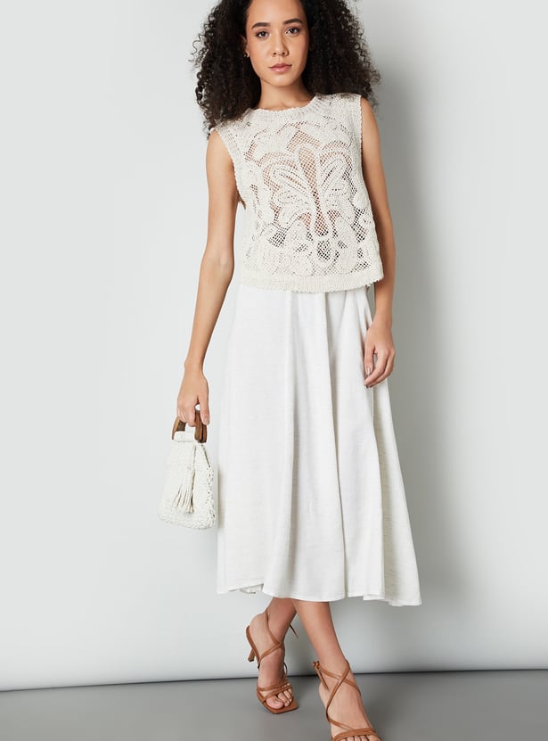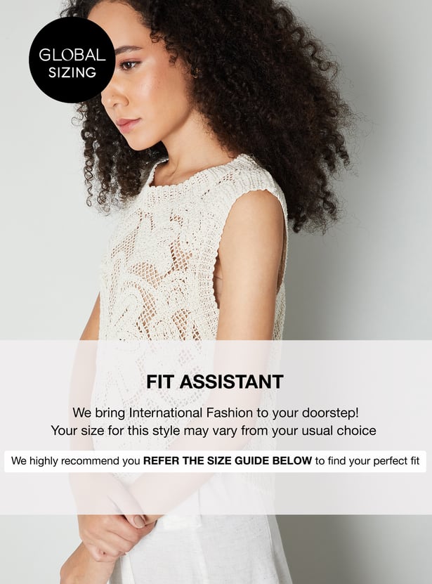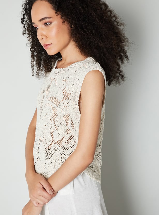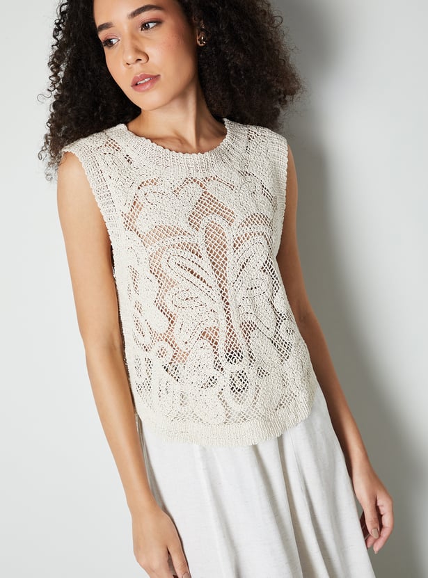 Add a touch of texture to your wardrobe with this crochet knit top, designed with a classic round neck and sleeveless style. The intricate crochet pattern gives it a breezy, feminine vibe, perfect for warm days.