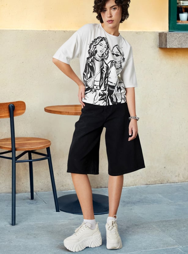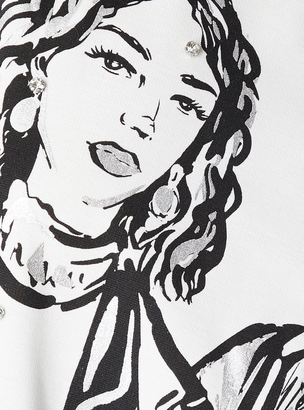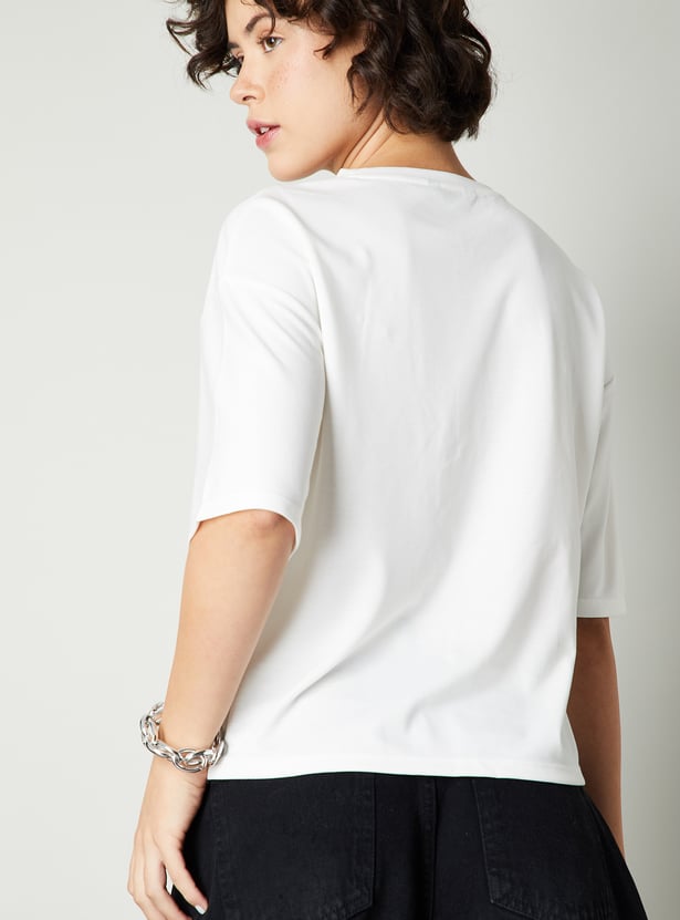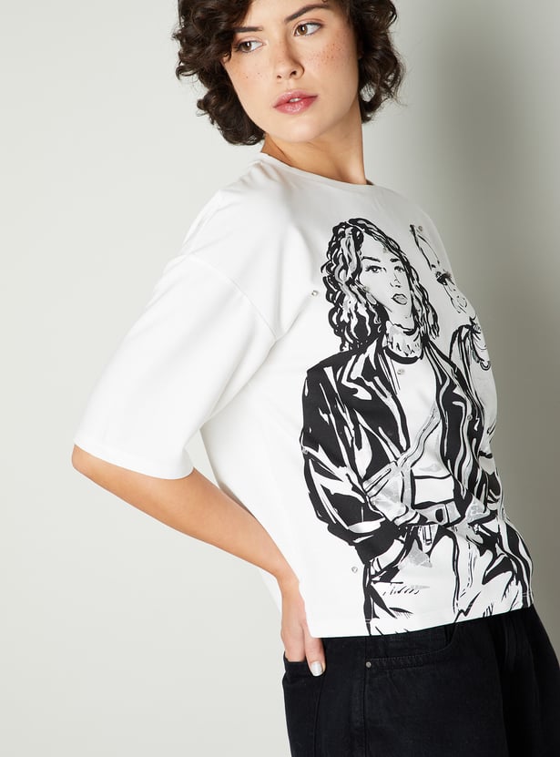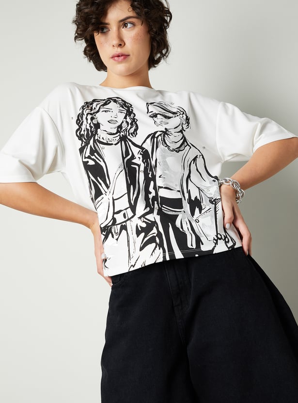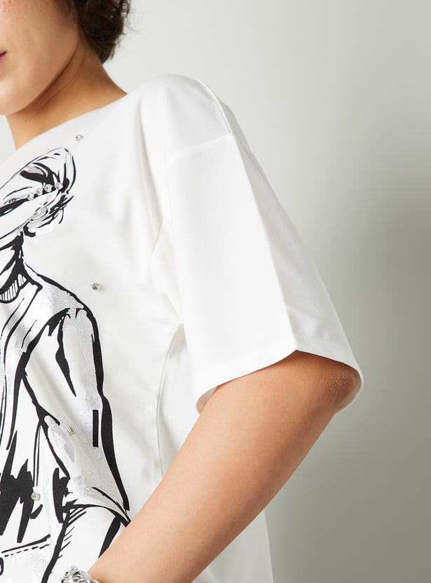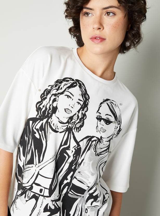 Embrace the laid-back vibe with this T-shirt, featuring a bold graphic print on the front and embellished details that add a stylish edge. Designed with sleek half sleeves and a classic round neckline, it brings a modern twist to your casual wardrobe.