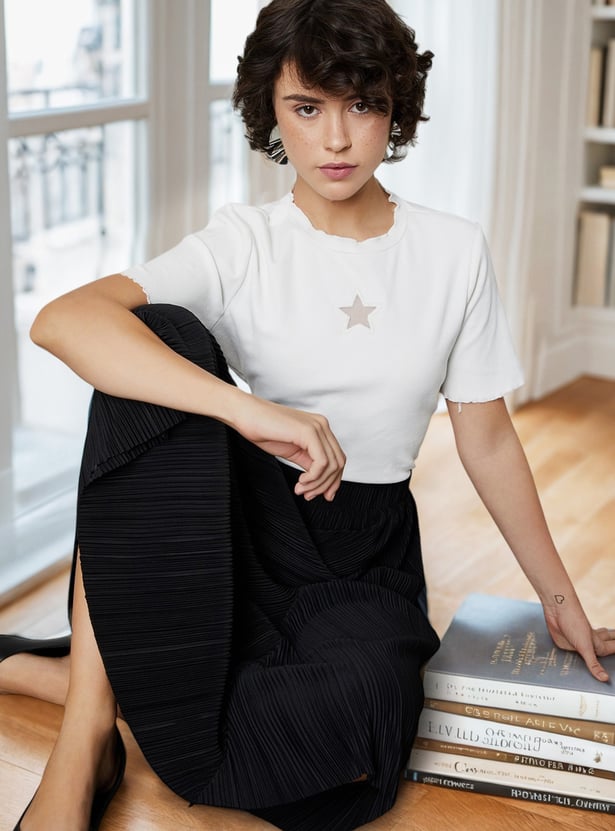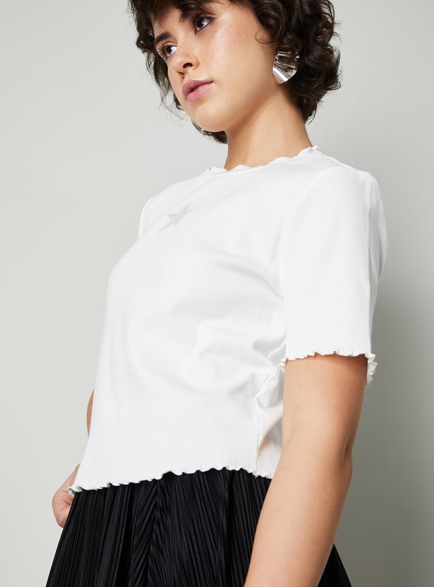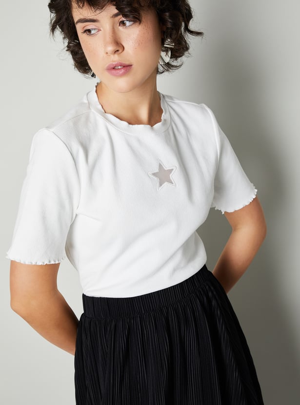 Keep it cute and cosy with this top. It features a playful lettuce edge along the hem and sleeves. The ribbed texture gives it a snug, fitted super comfy look, while the star applique adds a fun touch.