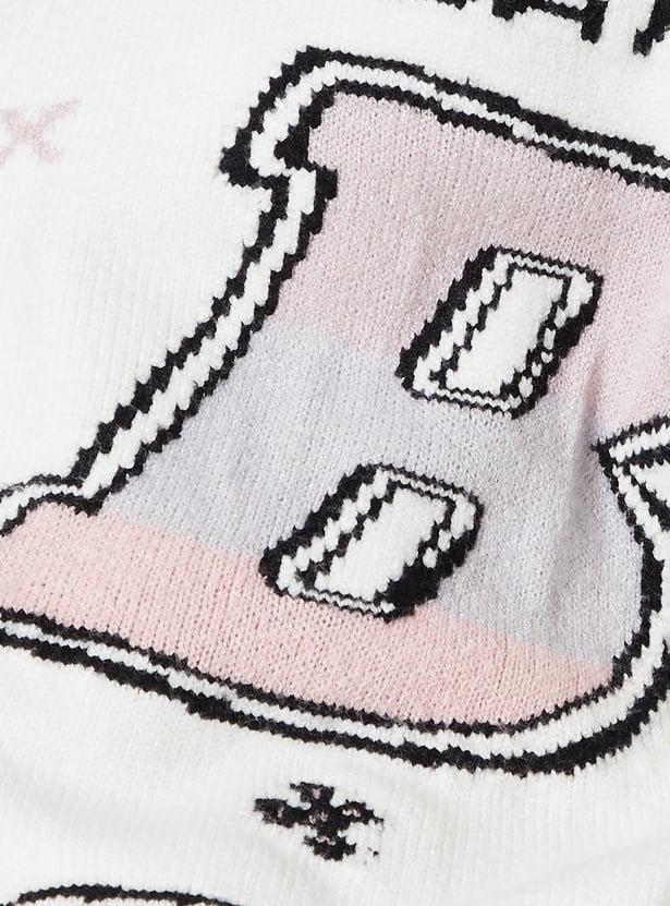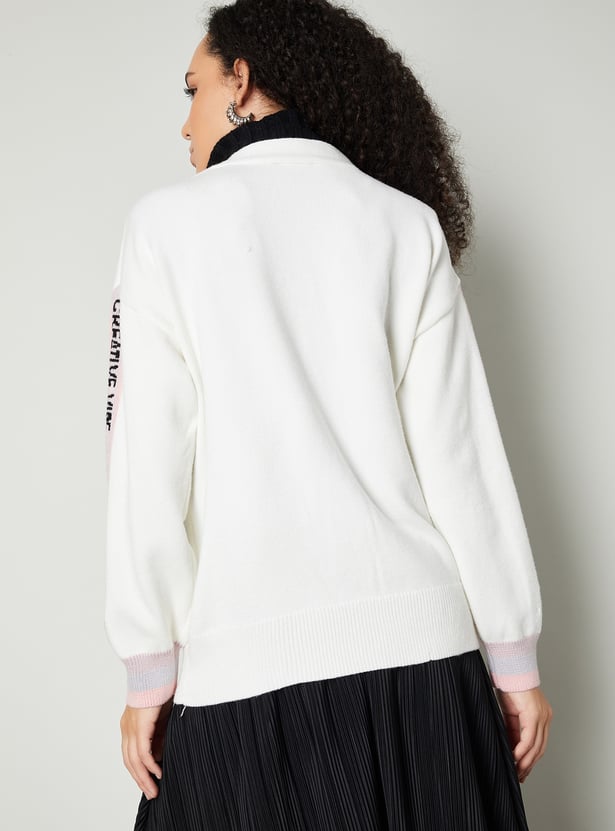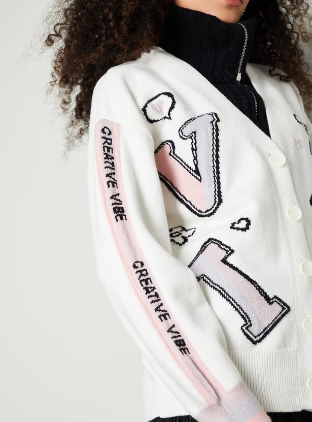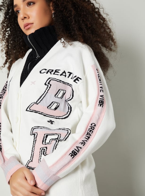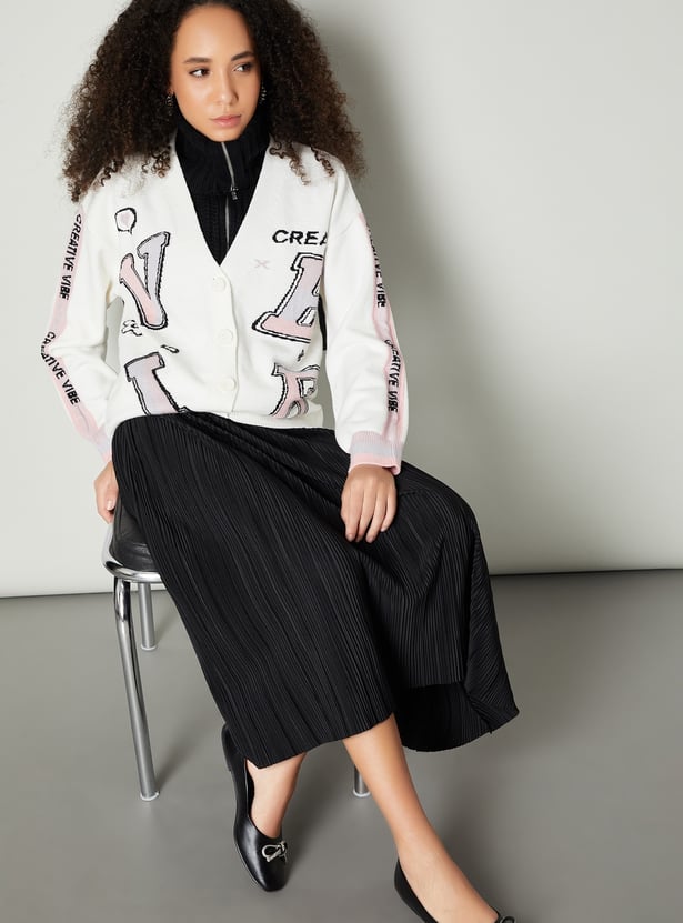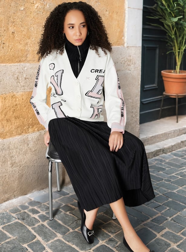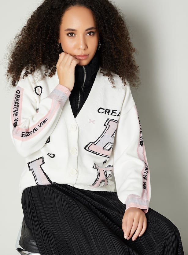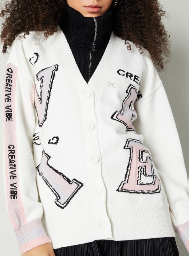 Stay cozy and stylish with this text knit oversized cardigan, perfect for layering over your favorite outfits. Featuring a button front, full sleeves, and a V-neck, it offers both warmth and a relaxed fit