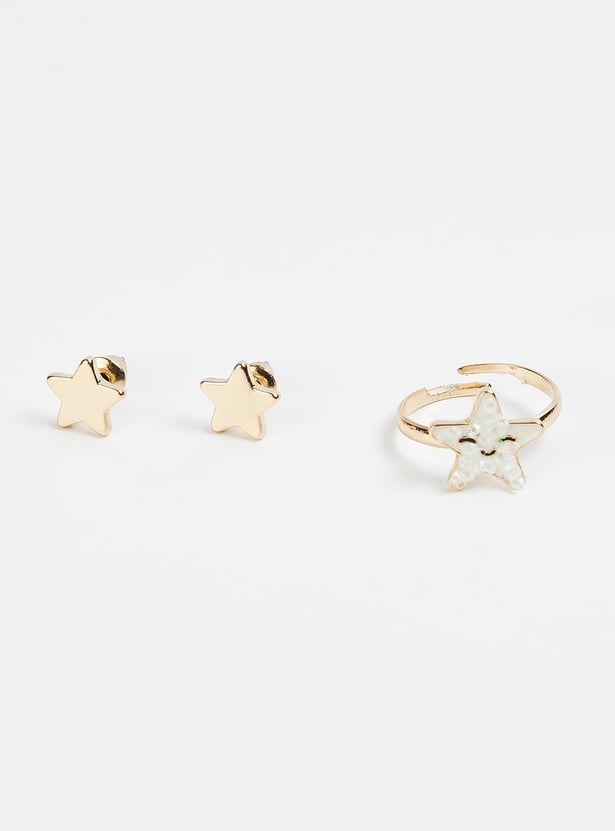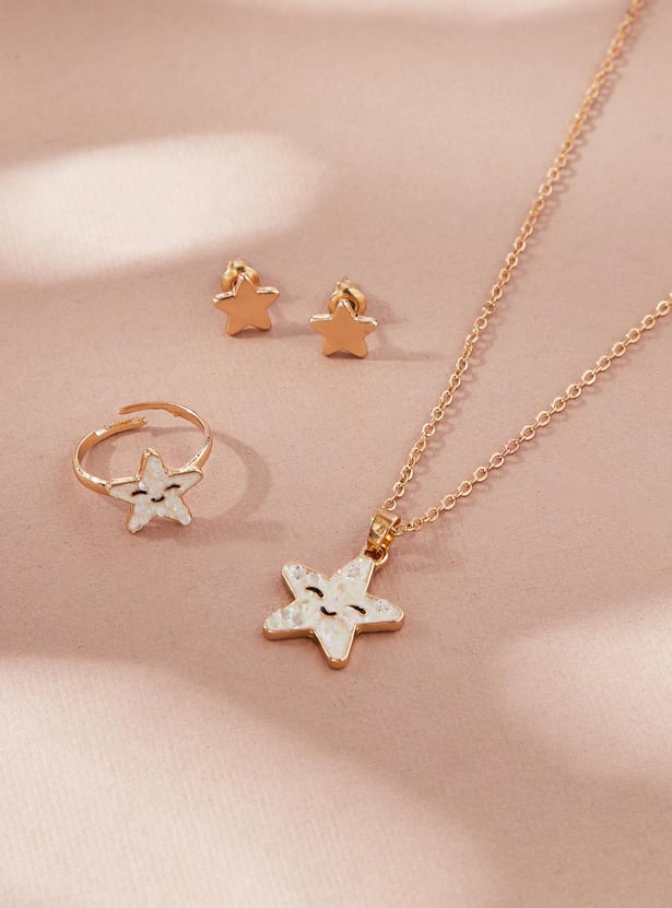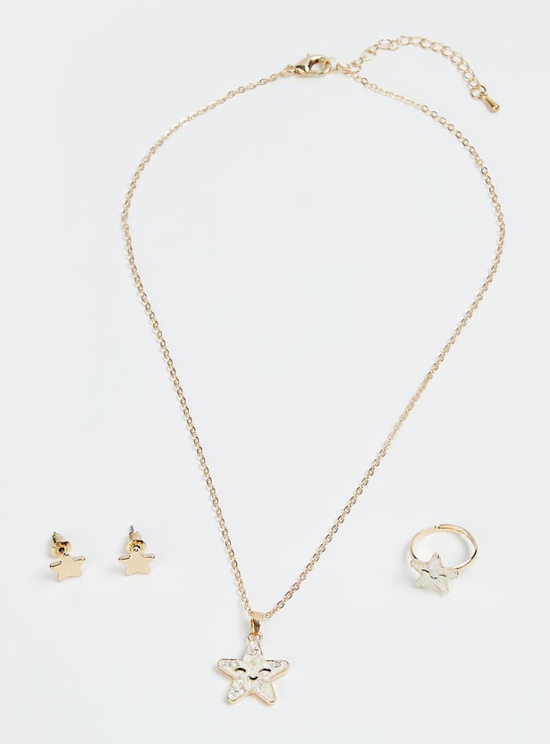 A perfect match for your little star, this set is brimming with sparkle and delight. It includes a chain with a star pendant, a pair of star earrings with push-back closure, and an adjustable finger ring.