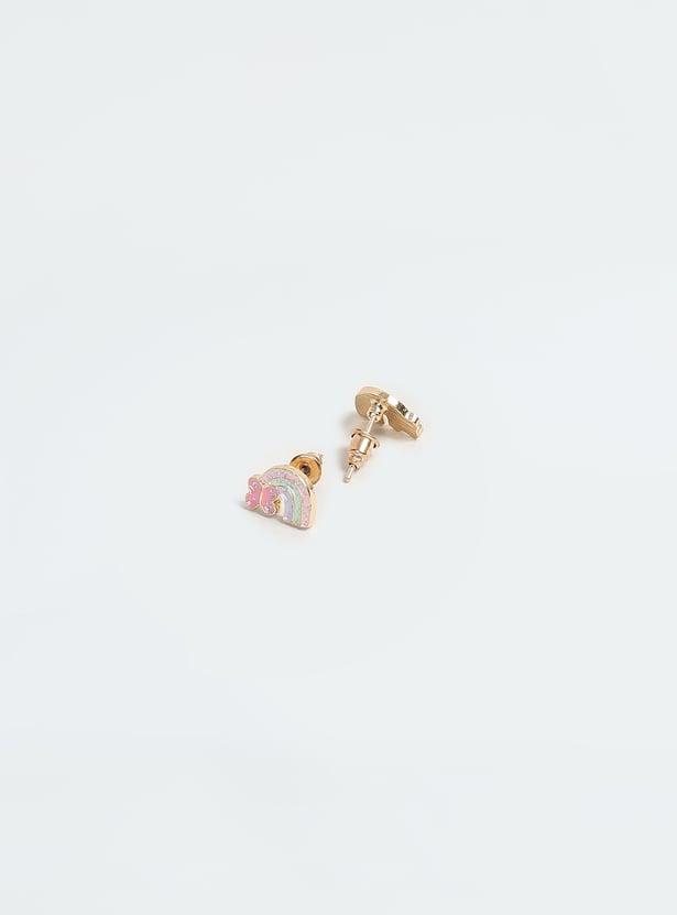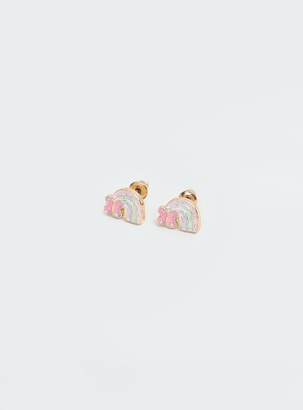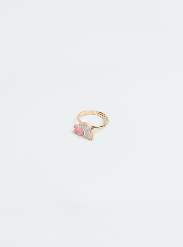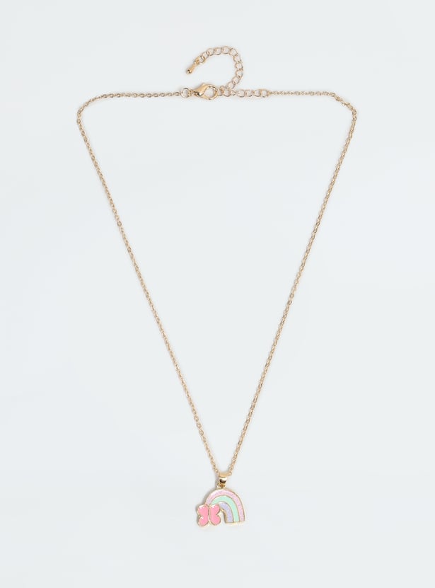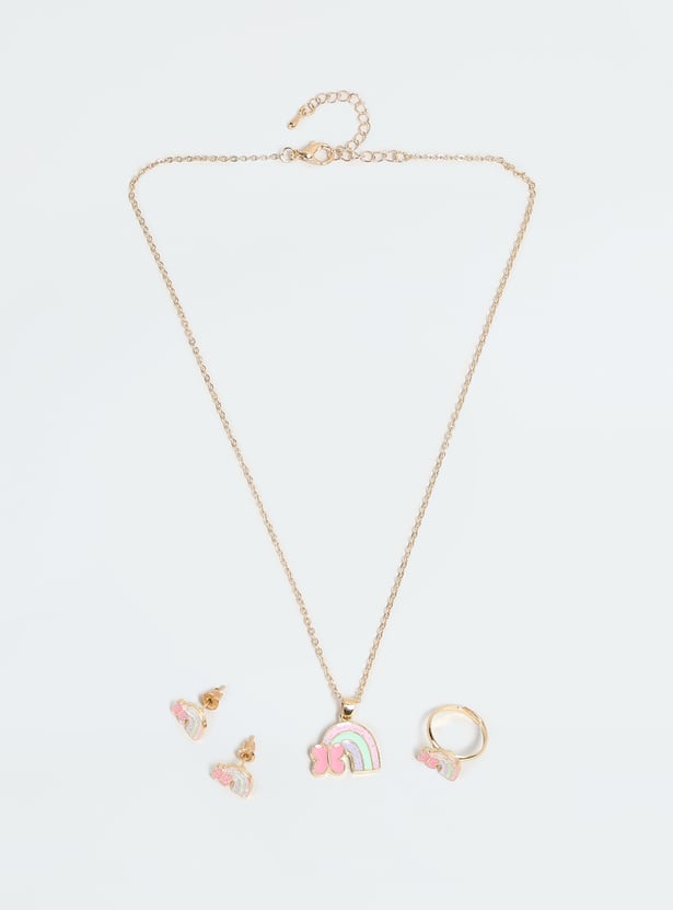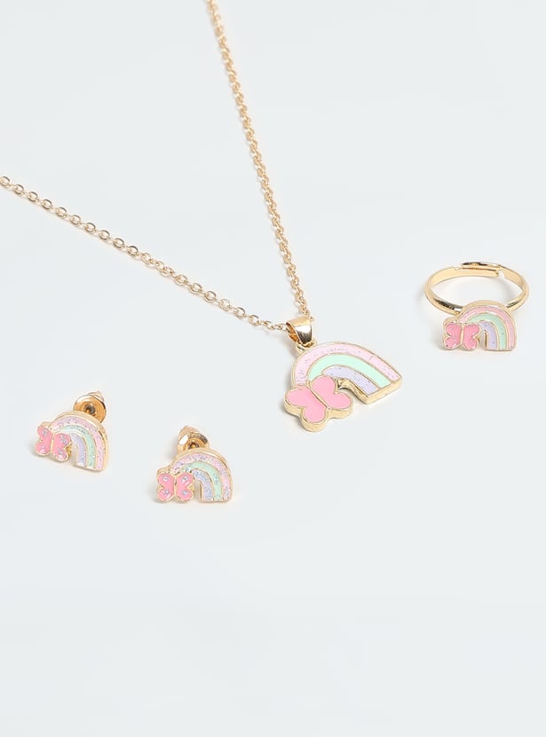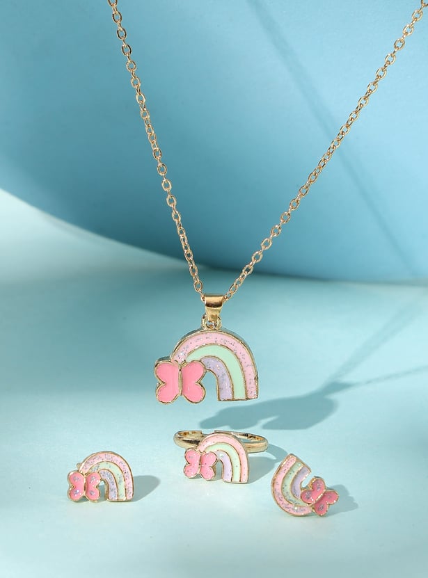 Add a pop of colour and sparkle to her outfit with this necklace set. The rainbow detail with a butterfly adds a cheerful look. It includes a rainbow pendant, stud earrings, and a ring.