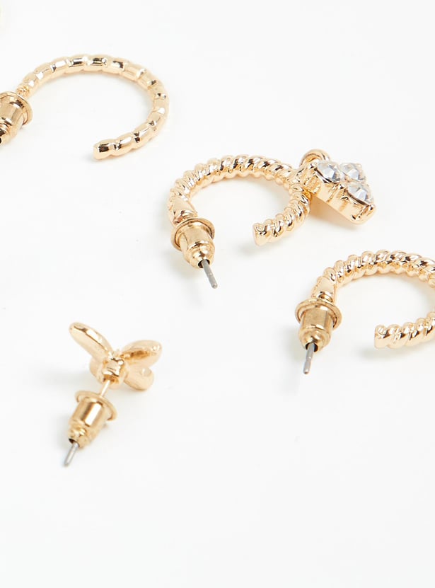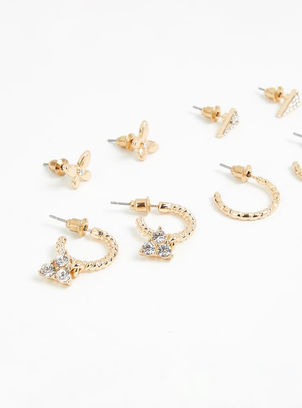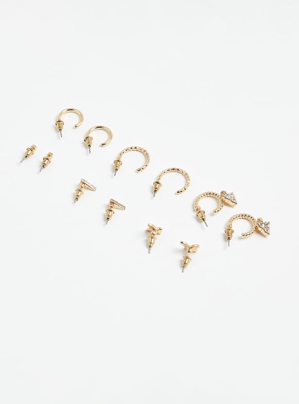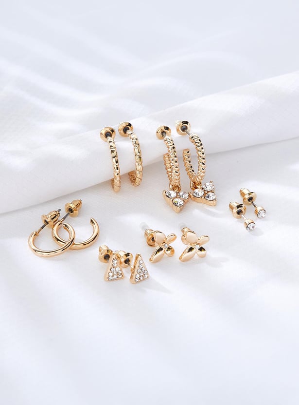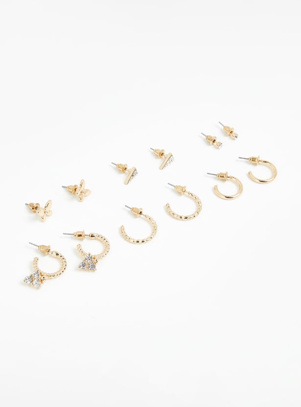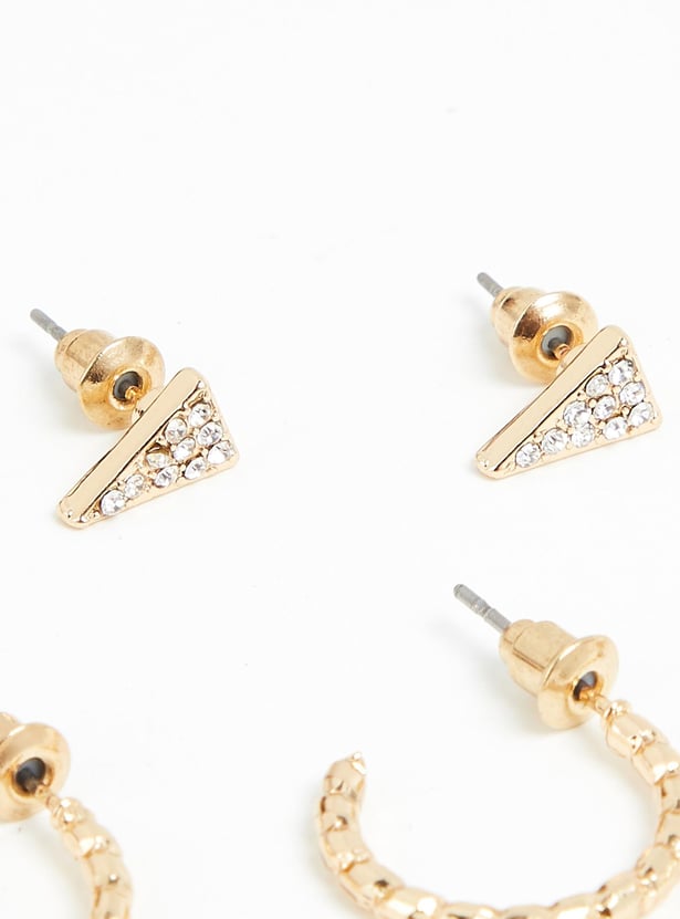 Accessorize your outfit and make it shine with this earring set. It has an embellished design and a post and back closure. It consists of three hoop earrings and three stud earrings.
