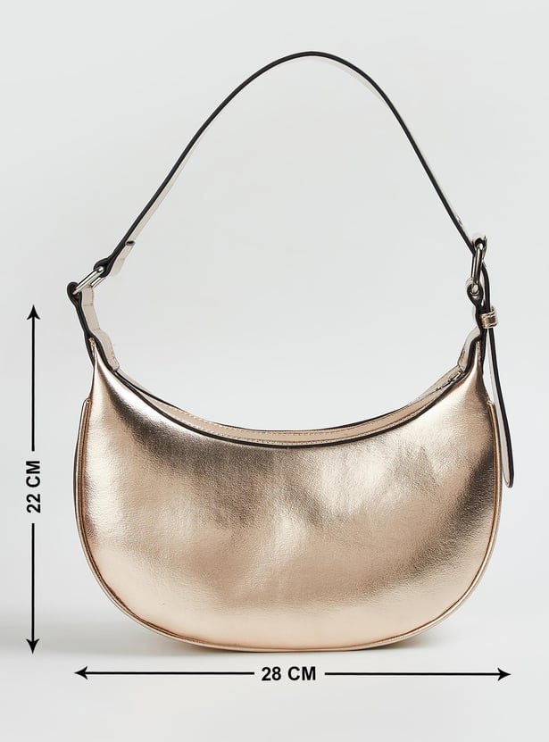 Glam up your day or night with this crescent-shaped bag. It has a metallic finished exterior, a short strap with grommets, and buckle detail. The compact main compartment with a zip top is perfect for your everyday essentials.