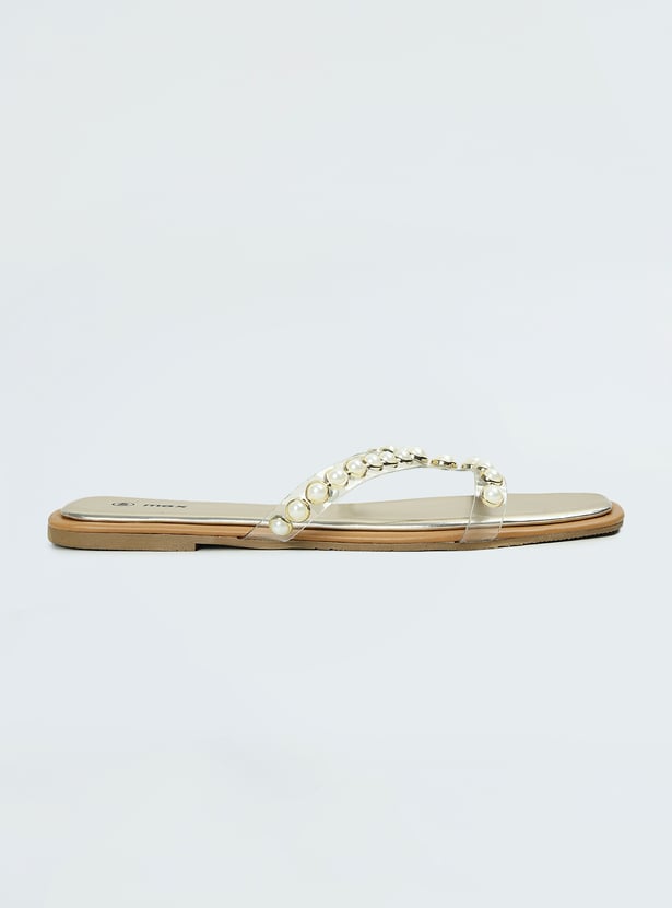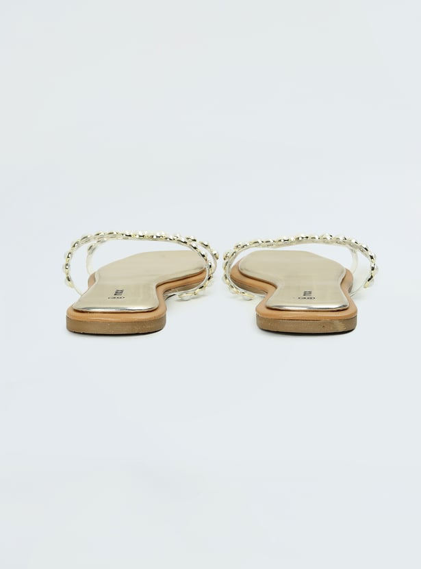 These flat sandals are designed with a luxurious pearl-embellished strap and an open-toe construction, combining elegance with comfort. Perfect for adding a touch of sophistication to any outfit while ensuring a comfortable fit for all-day wear.