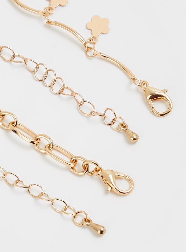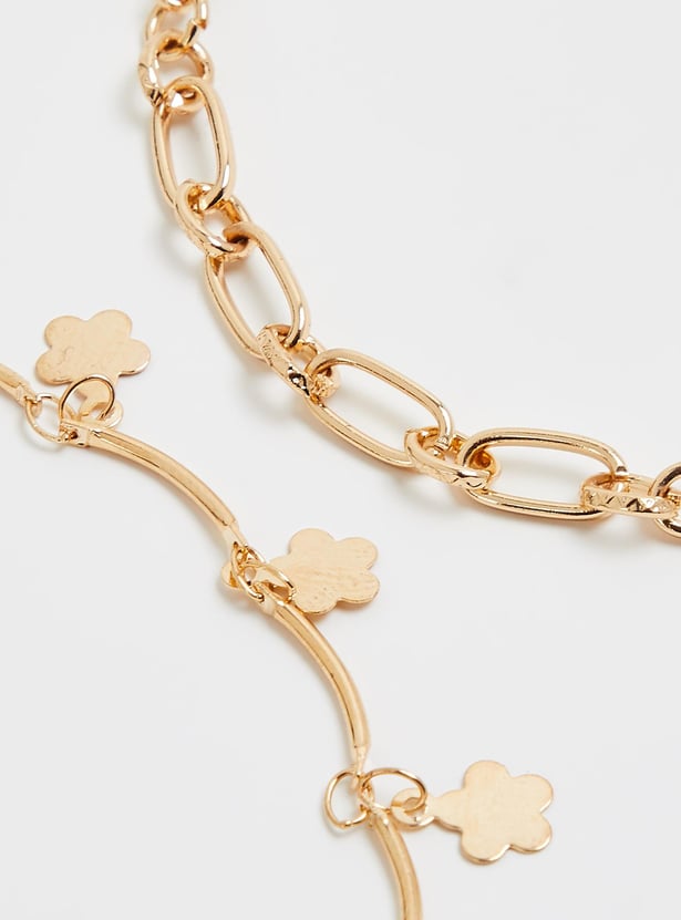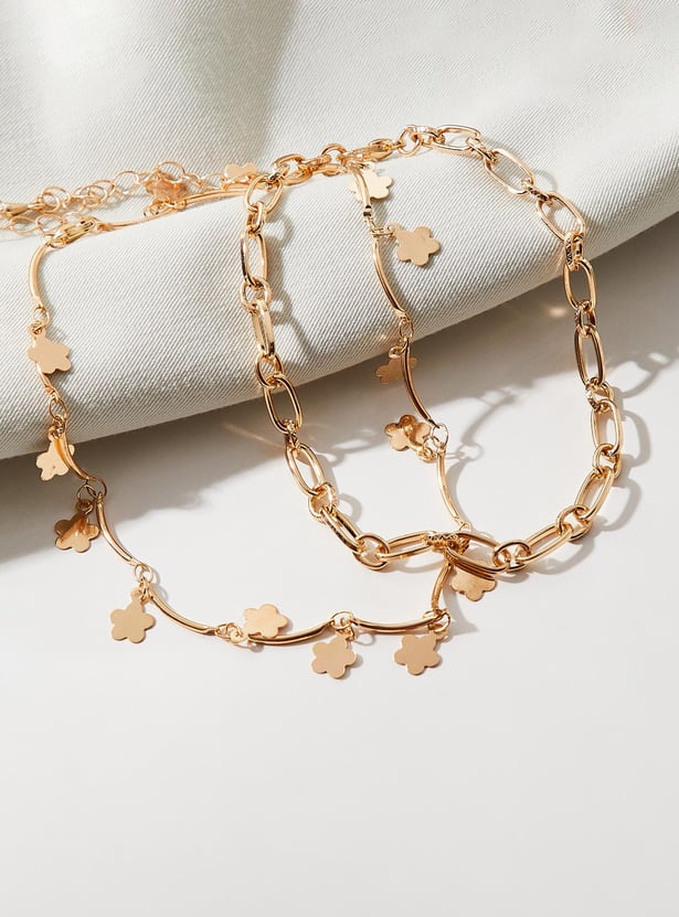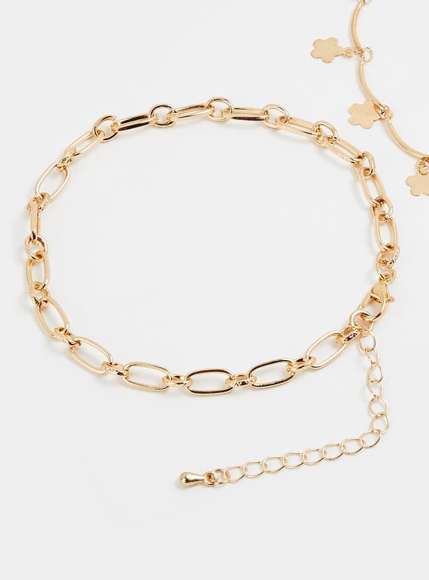Add a dainty finish to your outfit with this pair of anklets. It includes a curved anklet with floral charms and a chain link anklet. Lobster clasps secure these around your ankle.