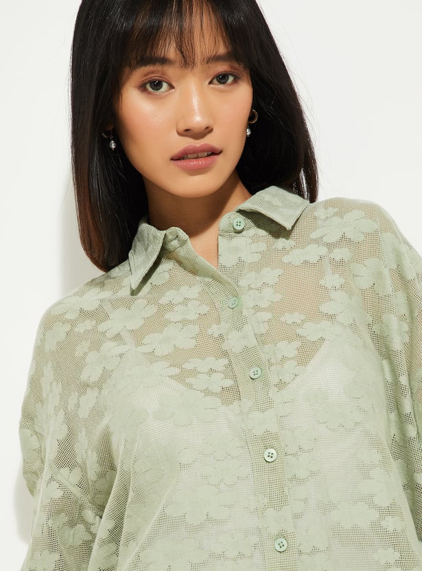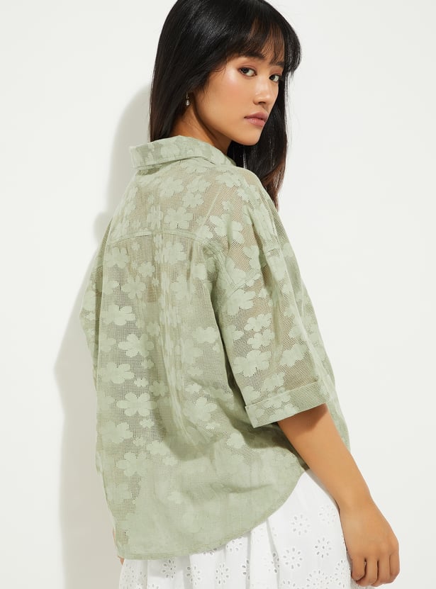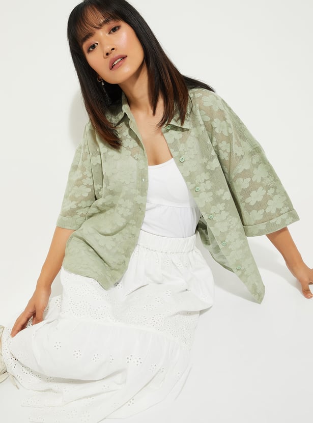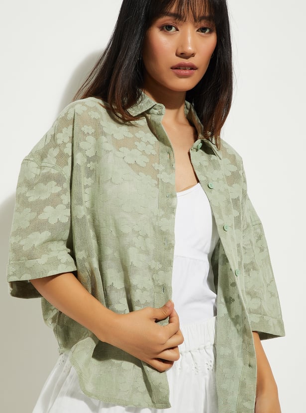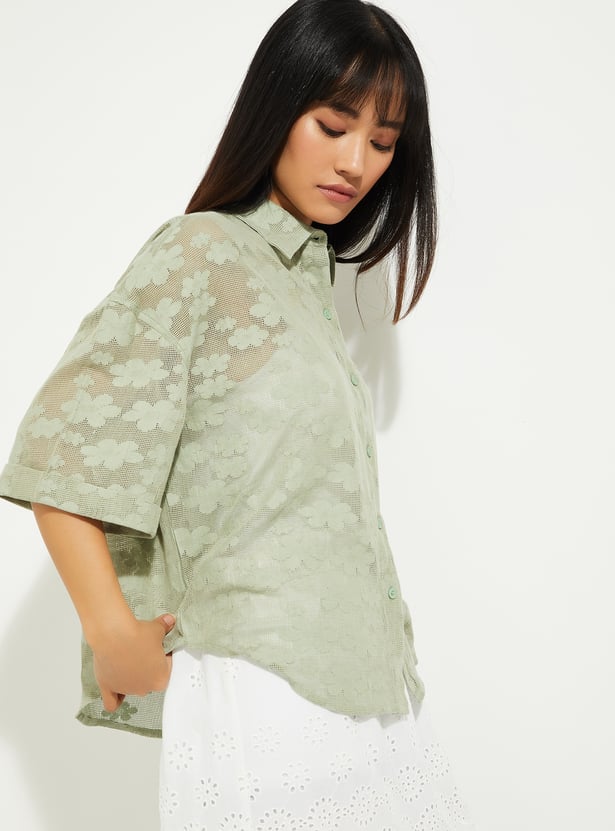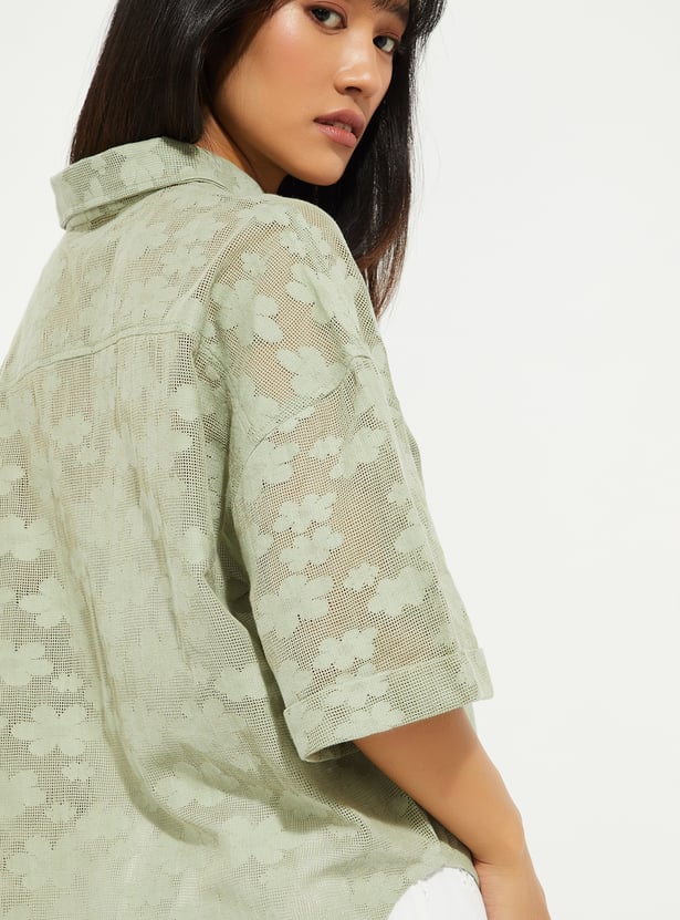 This lace boxy fit shirt features a collared neckline, a button placket, and half sleeves, offering a relaxed, airy look. The mesh fabric adds texture and breathability, while the boxy fit keeps it trendy and comfortable.