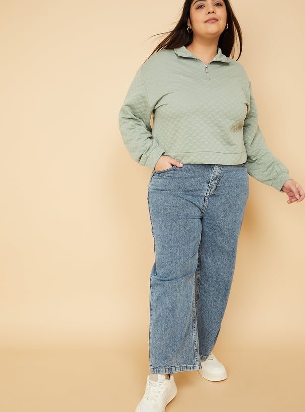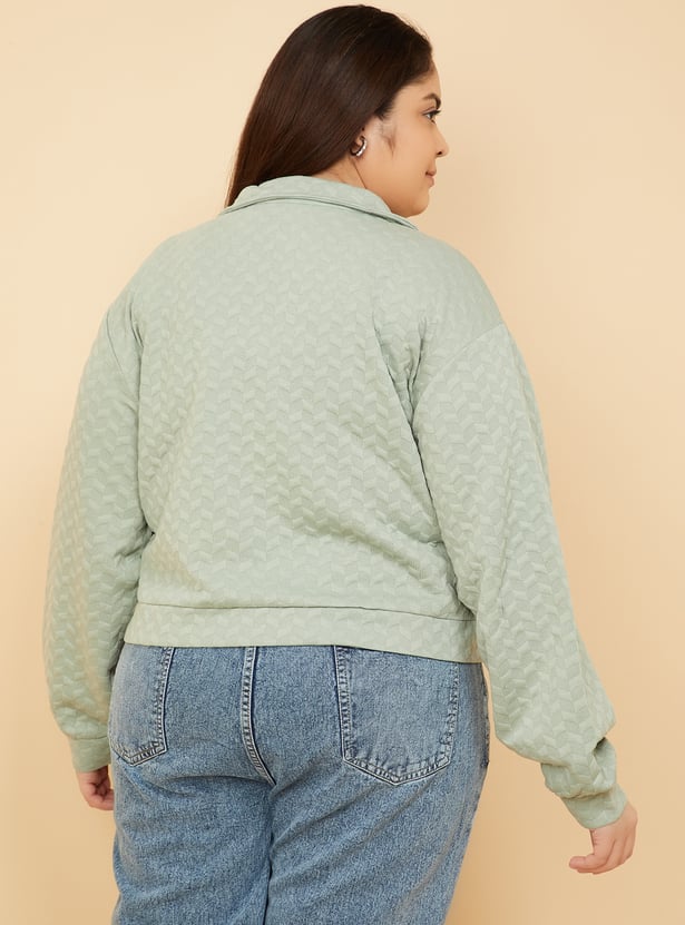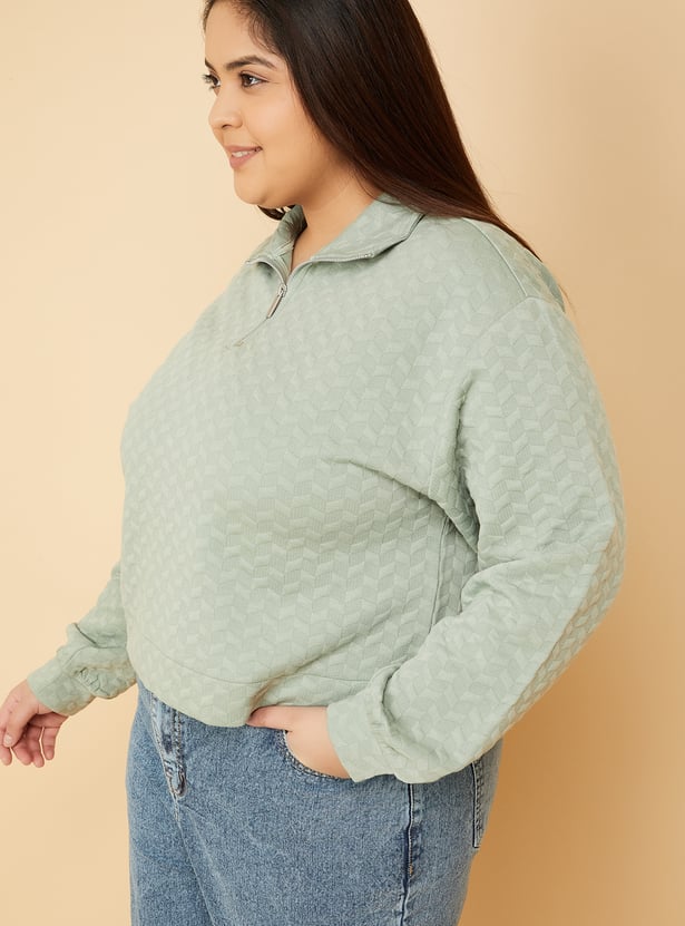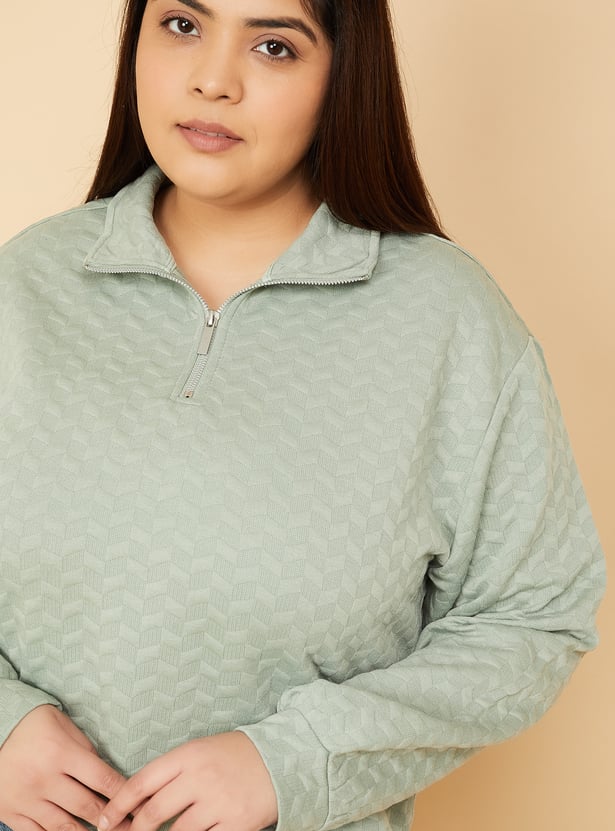 Elevate your winter staples with this textured sweatshirt featuring a boxy fit snug high neck and smooth zip closure. Designed with full sleeves for added warmth and comfort. Model Size :
