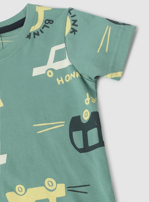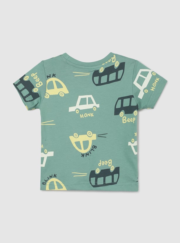 Spruce up your little one's vacation wardrobe with this comfy and stylish all-over printed T-shirt. Featuring short sleeves and a crew neck, it ensures both comfort and fun style for sunny days and exciting adventures.