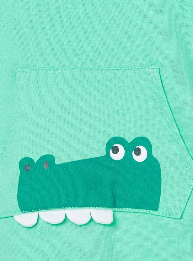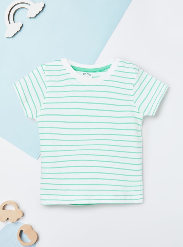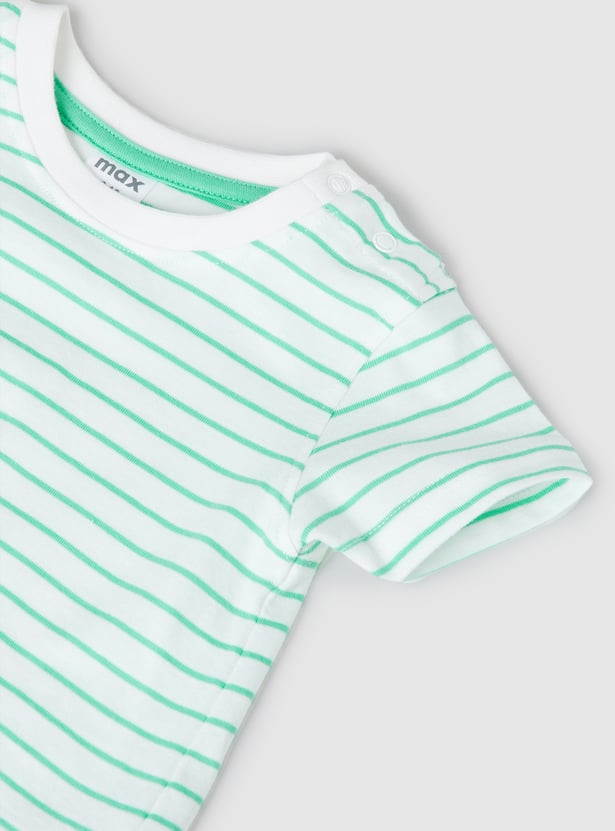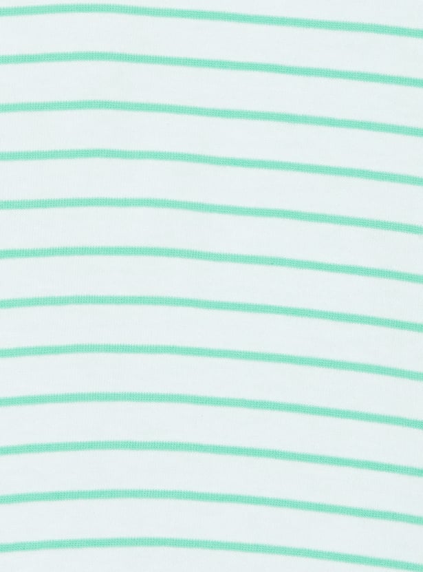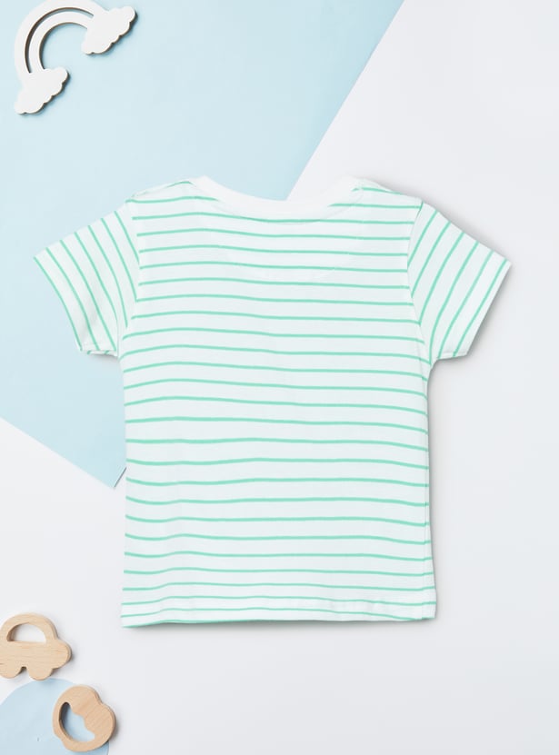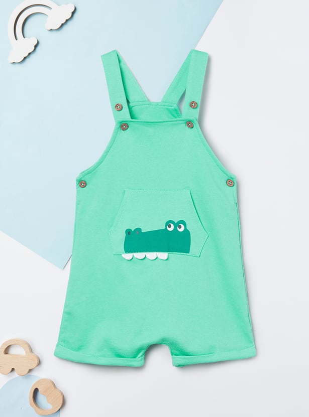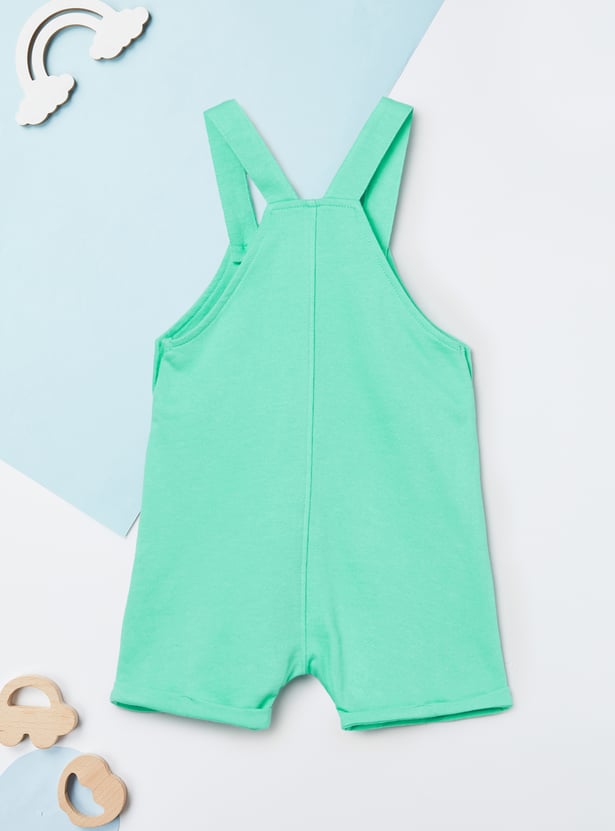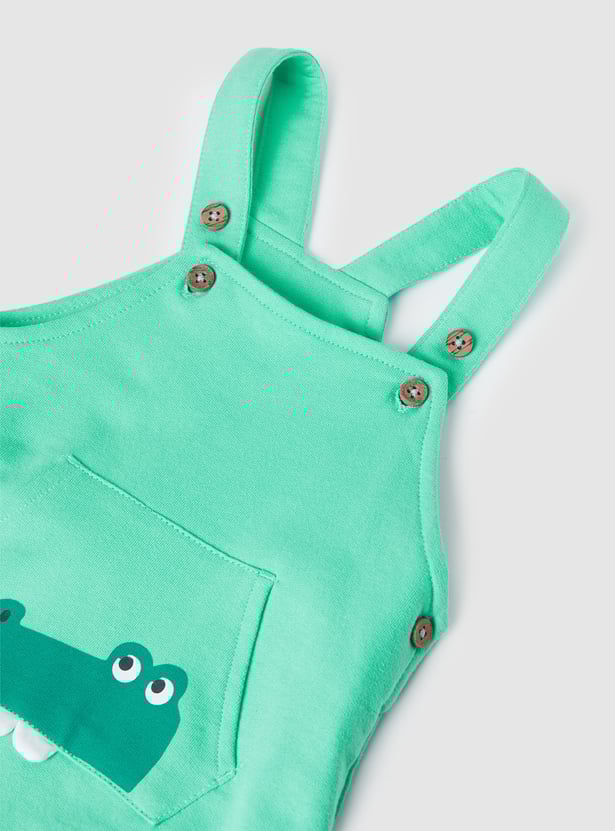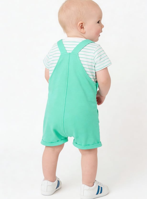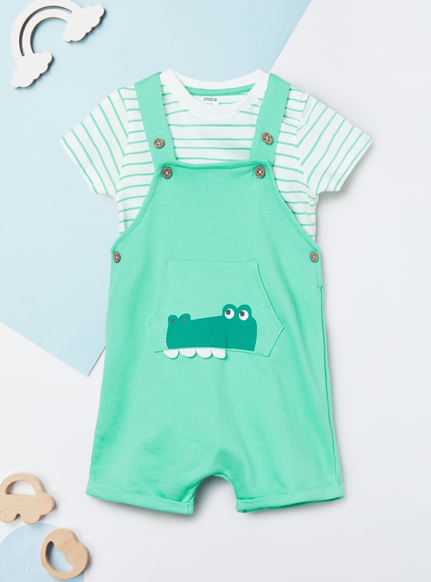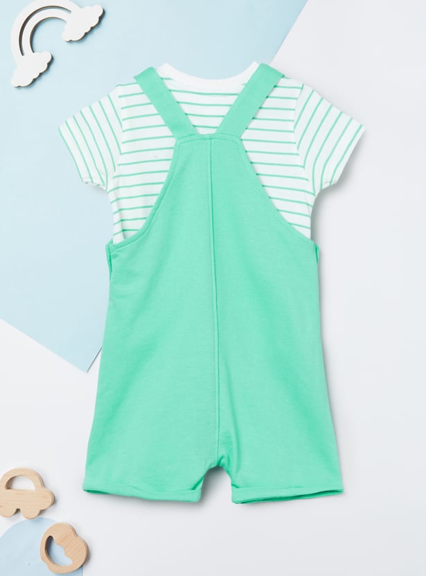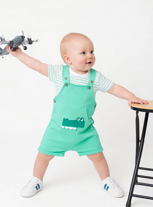 This printed dungaree and T-shirt set offers a cute and playful look for little ones. The appliqued dungaree features shoulder straps and a pocket, while the striped T-shirt is designed with a crew neck and half sleeves. Made from soft, comfortable fabric, the set ensures ease of movement and all-day comfort.