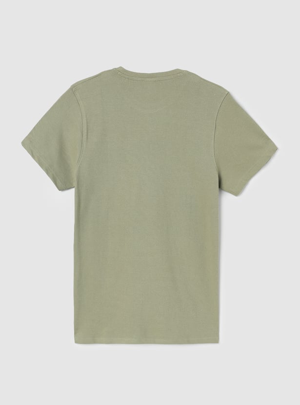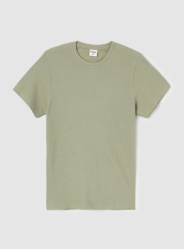 Upgrade his basic wardrobe with this T-shirt. It has a crew neck and half sleeves. The knit construction in solid tone ensures its versatility.