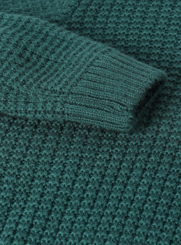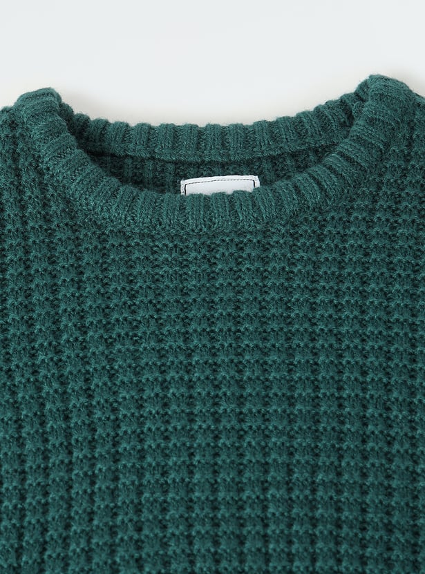 Induce comfort and style into your kid's winter wardrobe with this cosy knitted sweater. Featuring a crew neckline, ribbed hemline, and full sleeves, it ensures warmth and a snug fit, making it perfect for those chilly days.