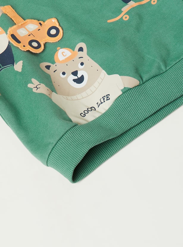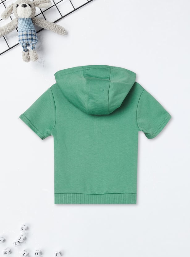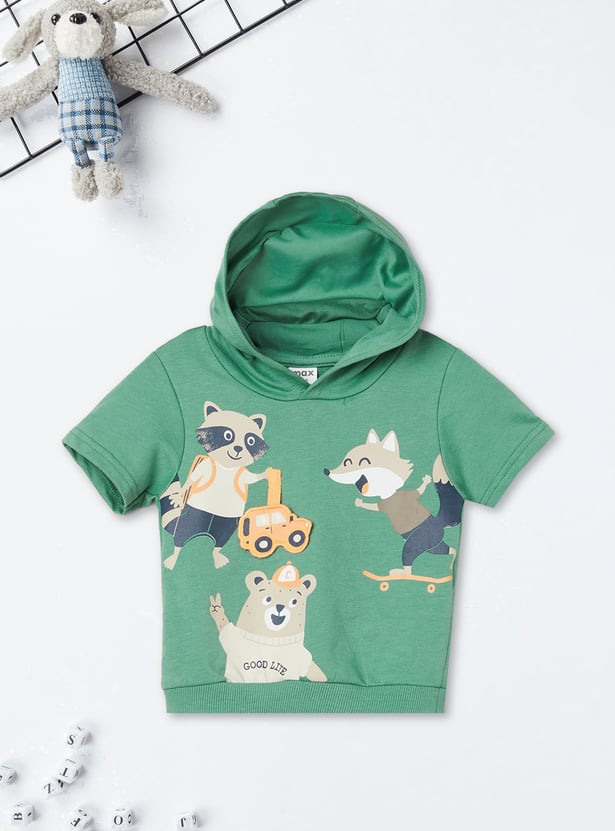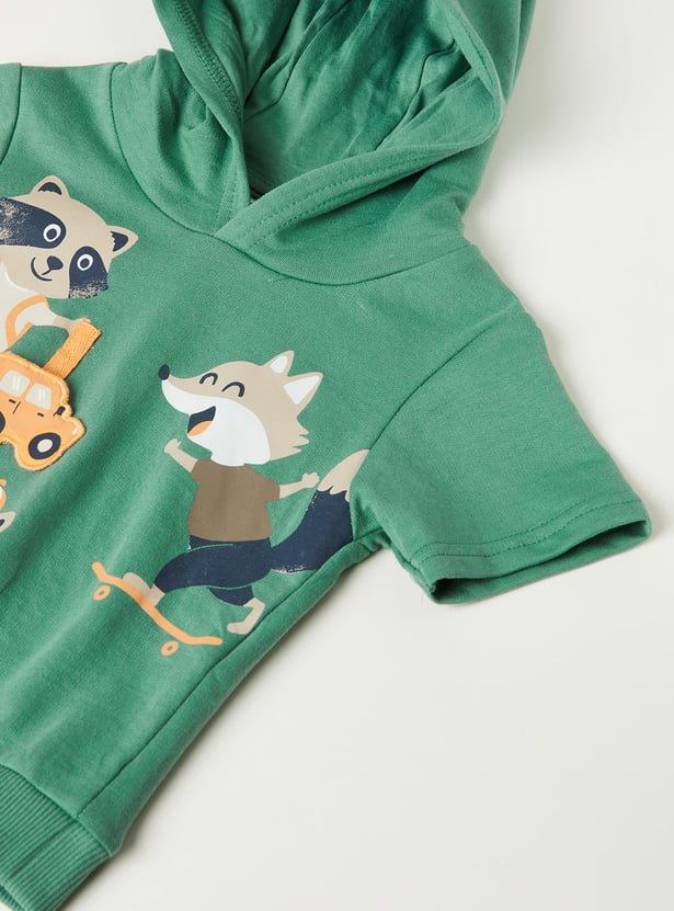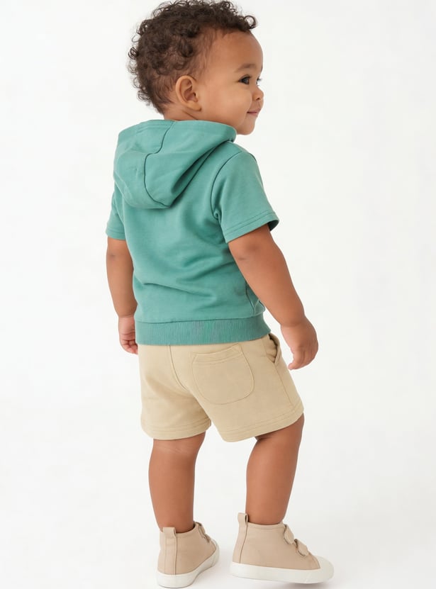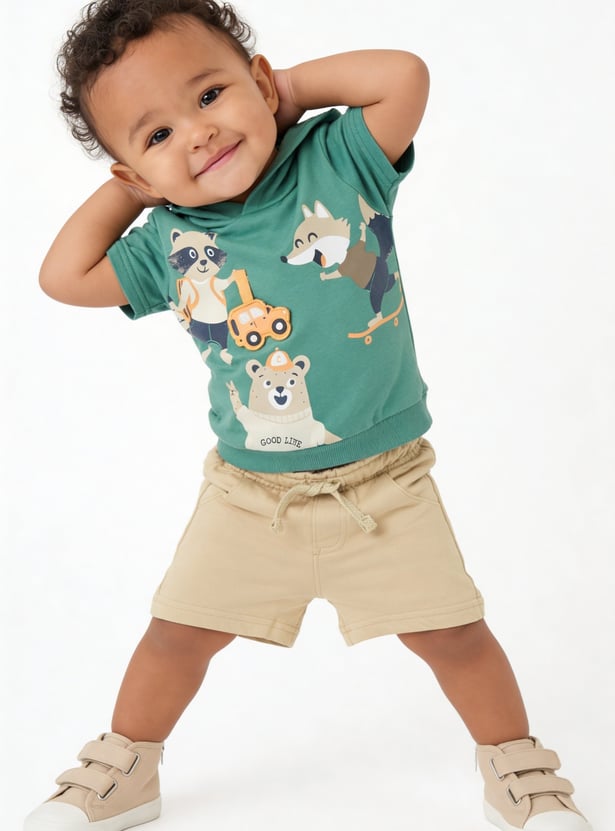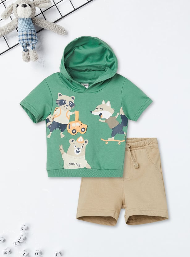 Upgrade your casual wear with this printed shorts set, featuring a hooded neck T-shirt with half sleeves for relaxed comfort. Paired with shorts designed with a drawstring closure and handy pockets, it’s the perfect blend of style and utility.