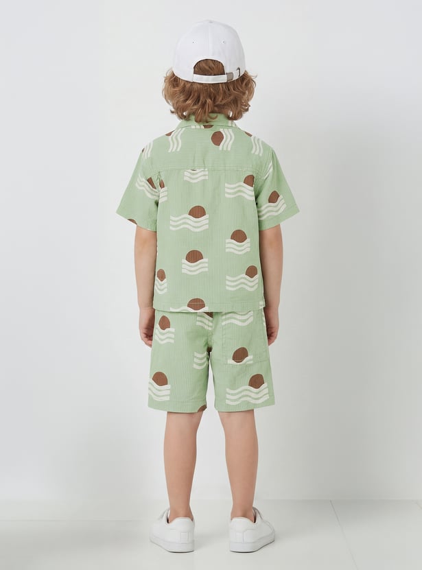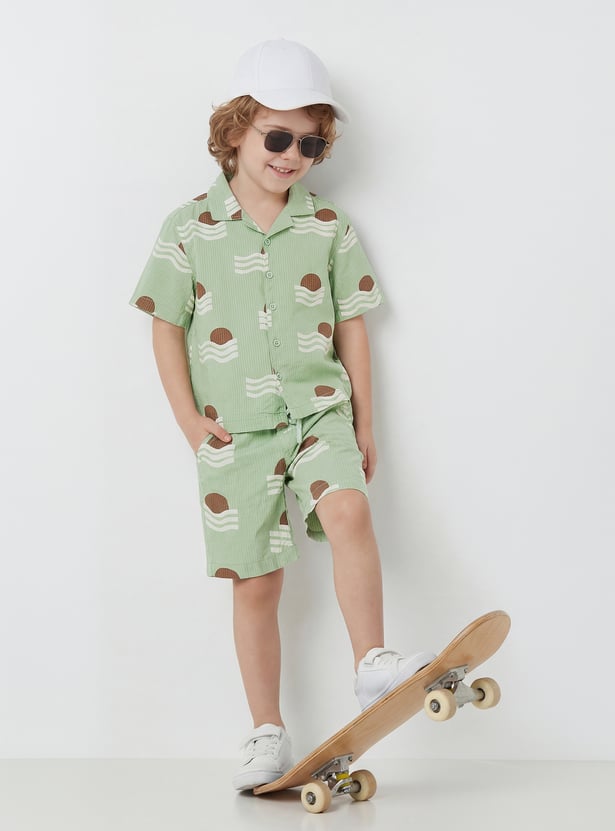 Refresh your little one's wardrobe with this shorts set designed for coordinated style and comfort. The shirt features an all-over mix of prints and stripes, detailed with a resort collar and half sleeves for a relaxed look. The matching shorts come with functional cross pockets and a back patch pocket, complemented by coordinating prints for a complete outfit.