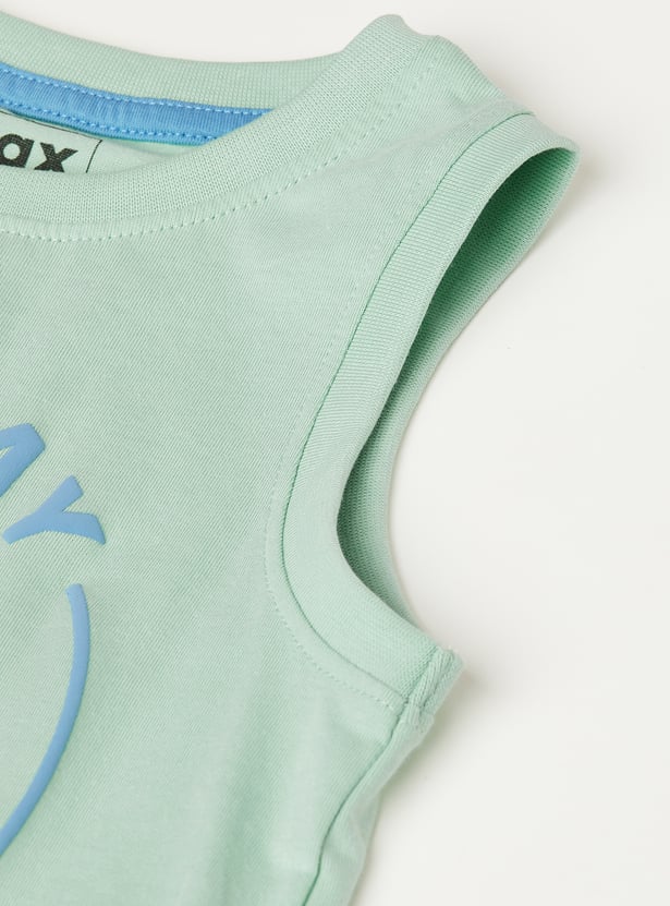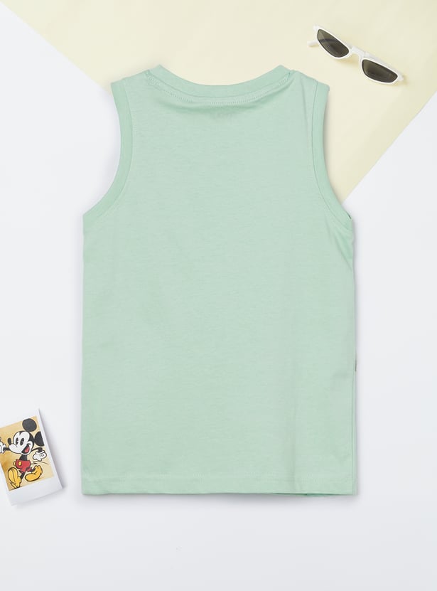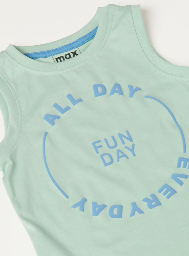 Stay cool and stylish with this printed sleeveless T-shirt, featuring a classic crew neck—perfect for warm days and layering.