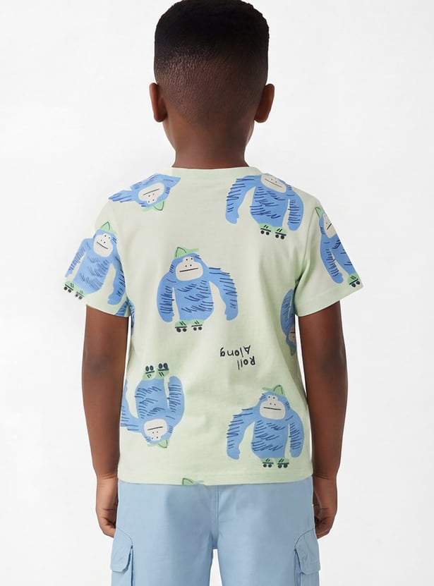 Add a playful touch to his everyday wardrobe with this printed T-shirt, designed with a classic crew neck and comfortable half sleeves. Featuring adorable all-over prints, it brings fun personality to casual looks while keeping him at ease through playtime and outings.