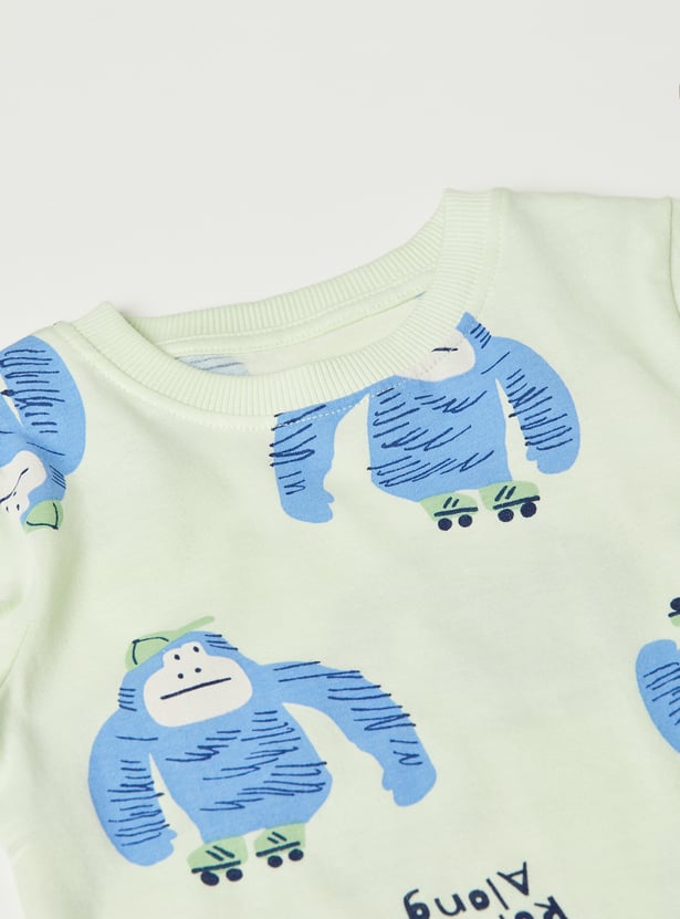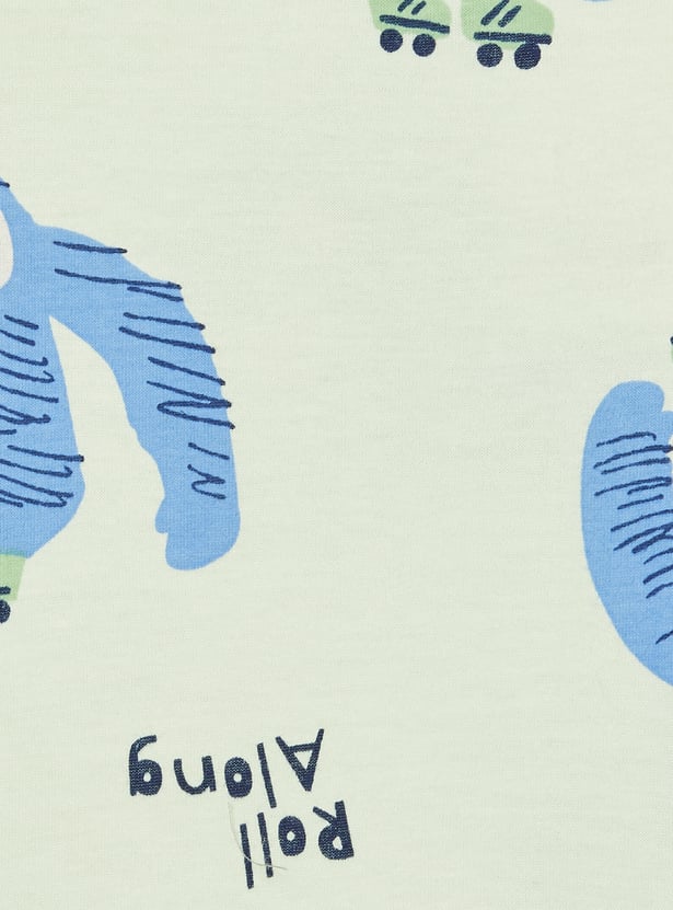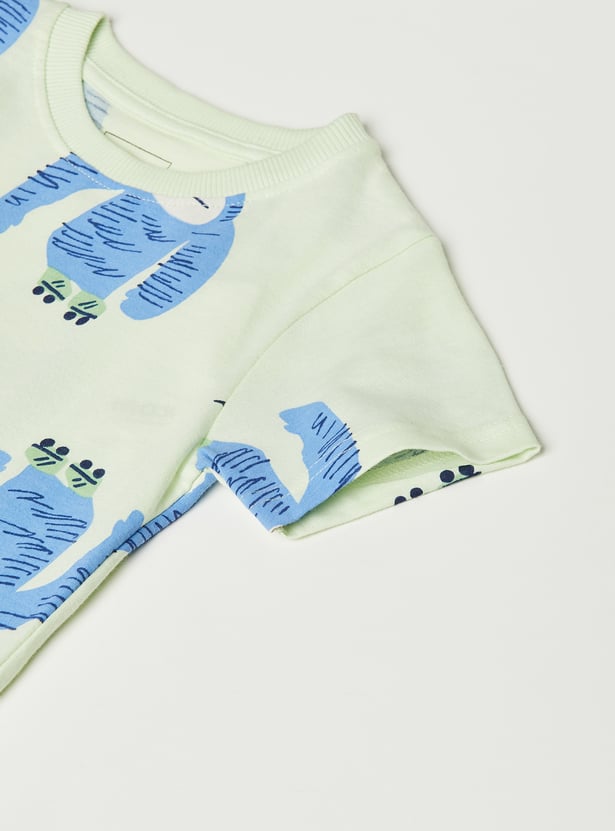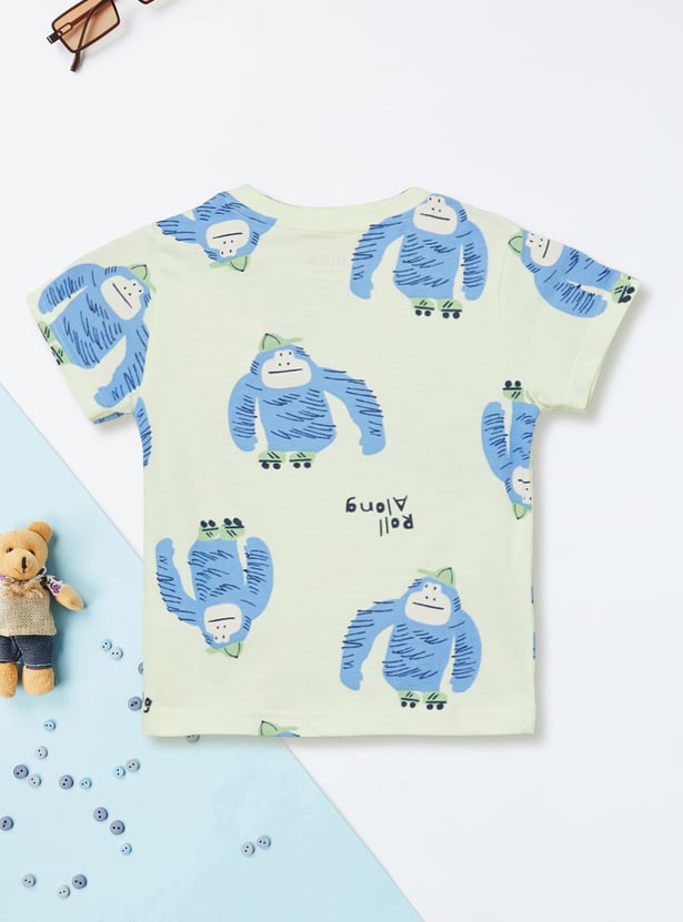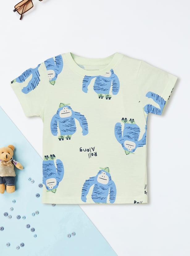 Add a playful touch to his everyday wardrobe with this printed T-shirt, designed with a classic crew neck and comfortable half sleeves. Featuring adorable all-over prints, it brings fun personality to casual looks while keeping him at ease through playtime and outings.