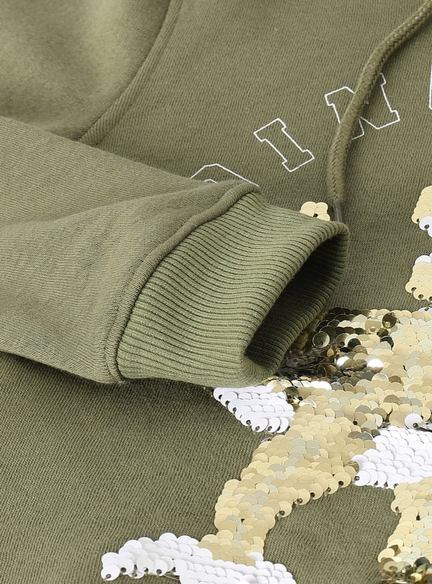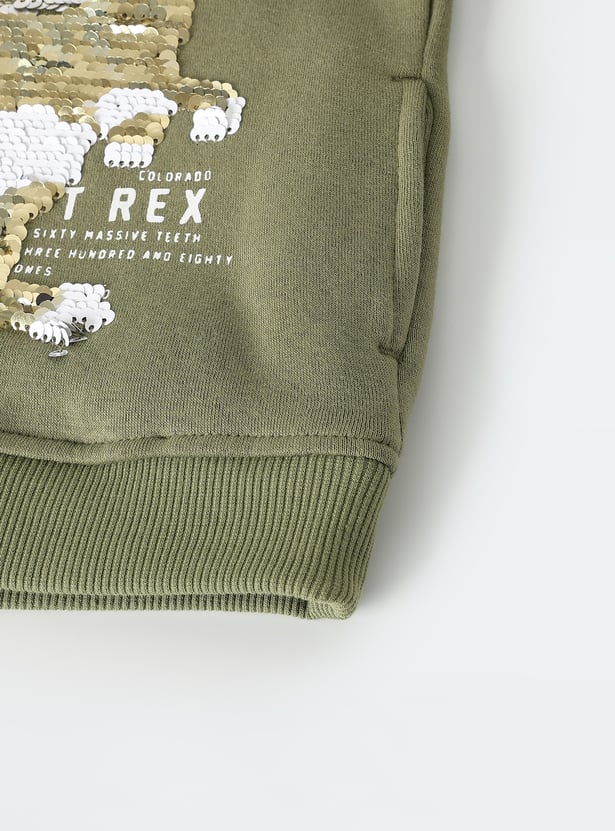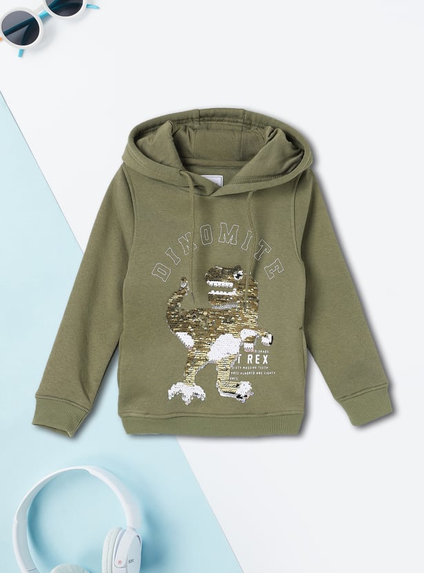 Let him roar into style with this sweatshirt. The cool dinosaur design in reversible sequins can change the look with a simple swipe for an interactive twist. The hood with full sleeves and ribbed trim ensures the cosiness, while side pockets ensure added functionality.