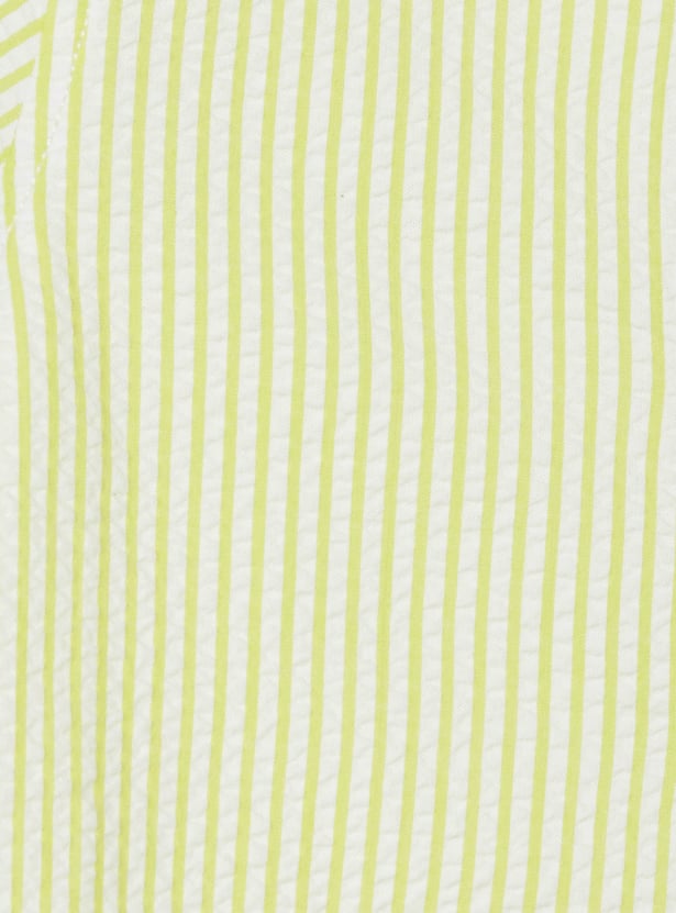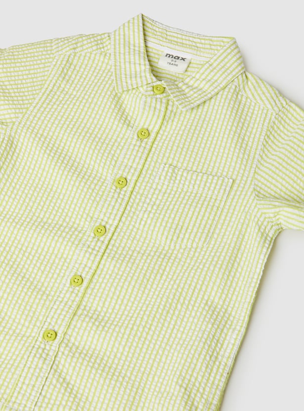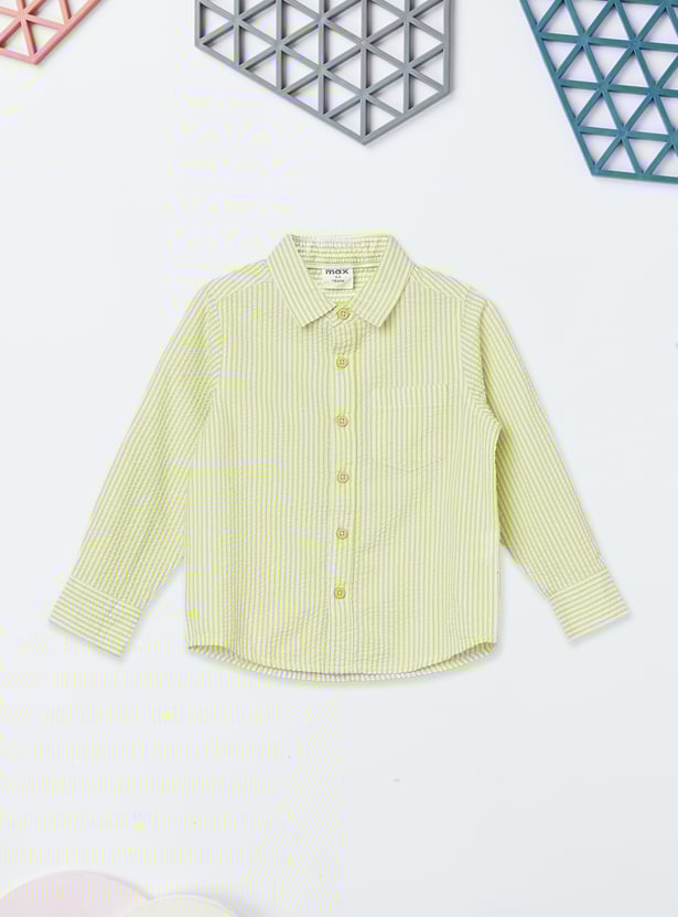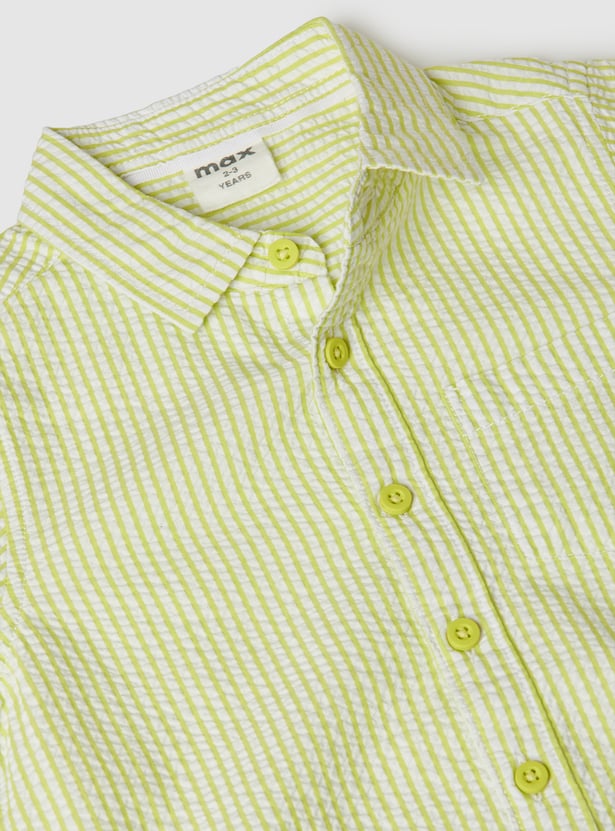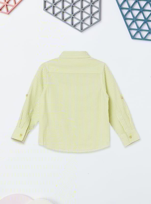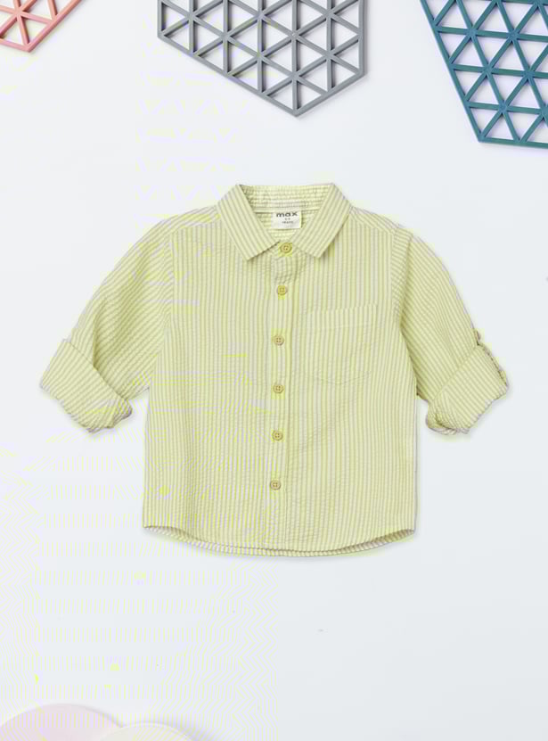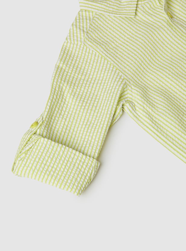 Dress your little one in this stylish seersucker striped shirt, featuring a classic spread collar and full sleeves with fold tabs for a versatile, trendy look. The light, textured fabric adds extra comfort for all-day wear.