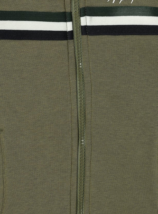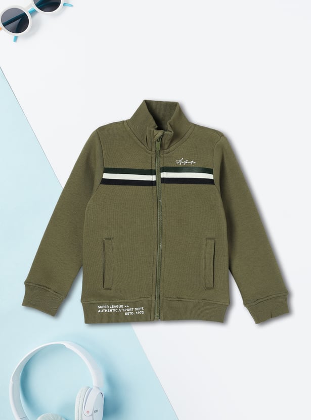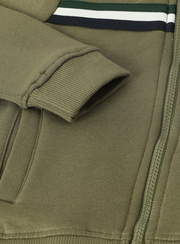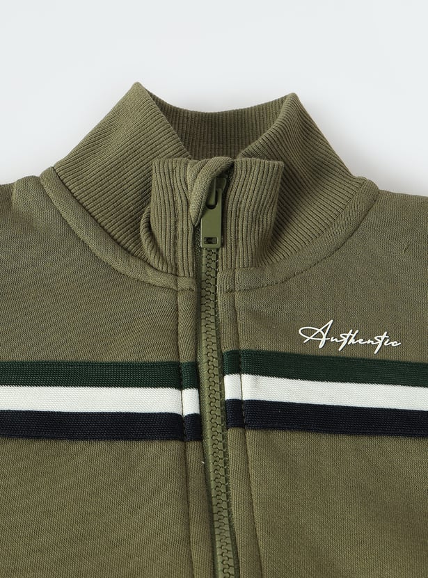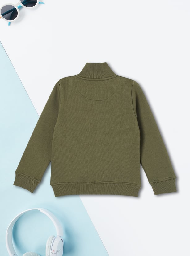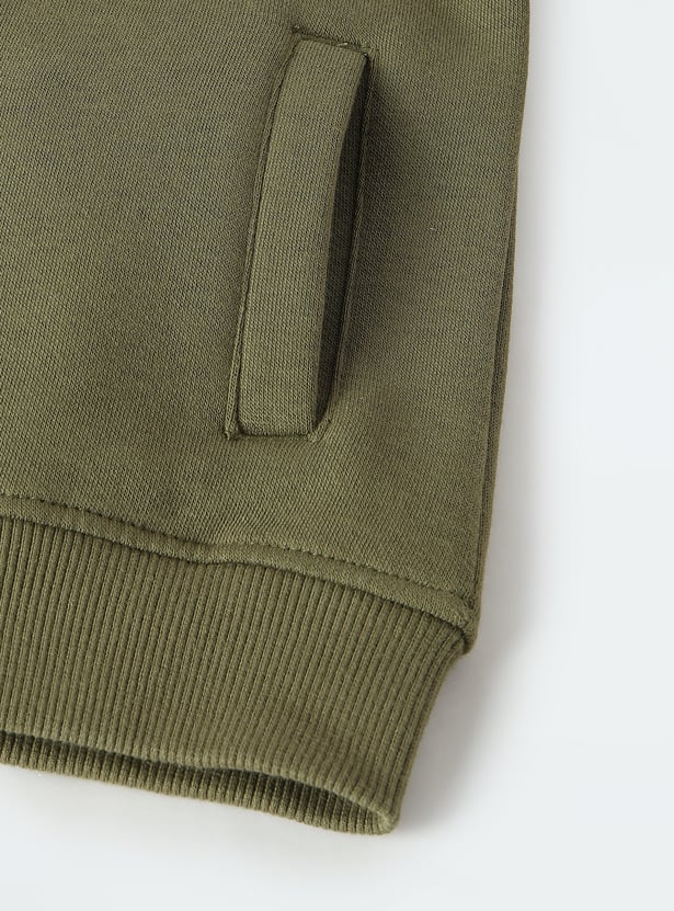 Keep your kid cosy and warm with this stylish sweatshirt, perfect for winter adventures. Featuring stripes on the front, a mock collar with a zip, full sleeves, and pockets, it combines comfort with a trendy look. The ribbed hem adds a snug finish, making it ideal for all their playtime fun.