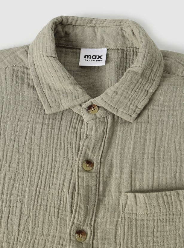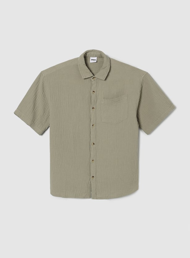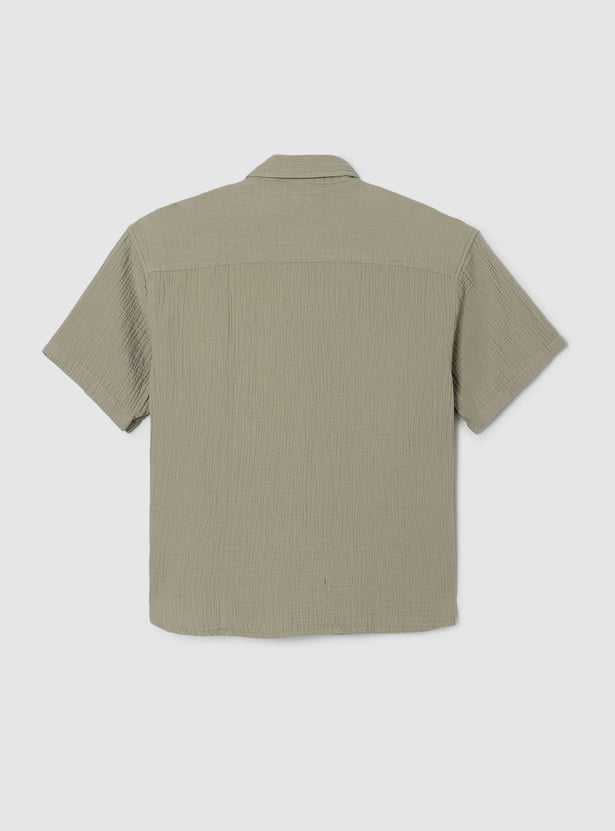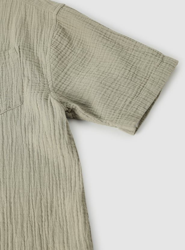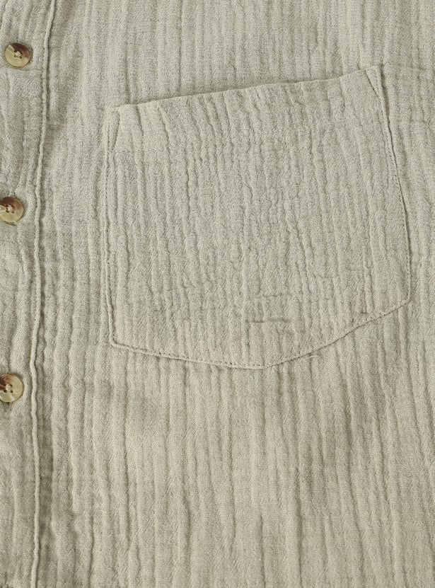 Elevate your casual style with this textured shirt, featuring a spread collar and a button placket for a sharp look. The half sleeves and patch pocket add both comfort and functionality. A versatile piece that’s perfect for everyday wear or a laid-back outing.