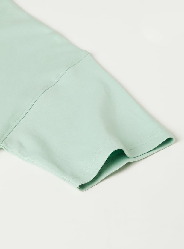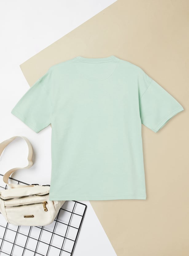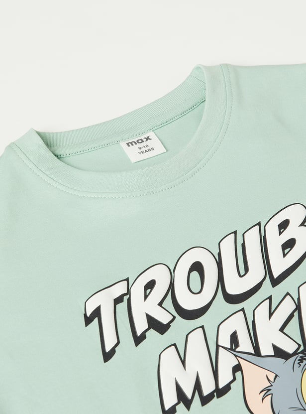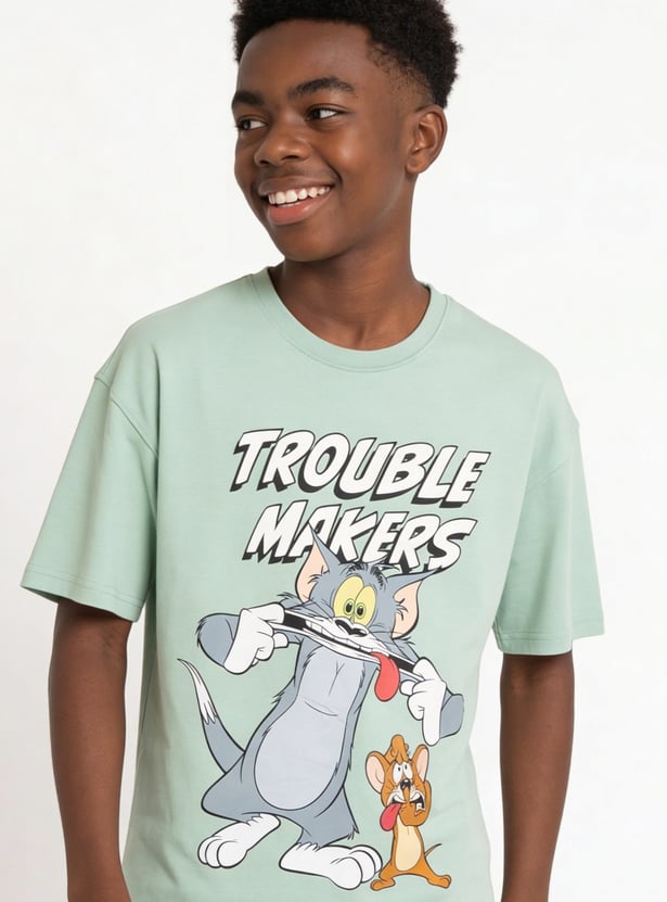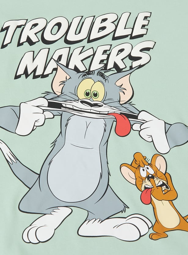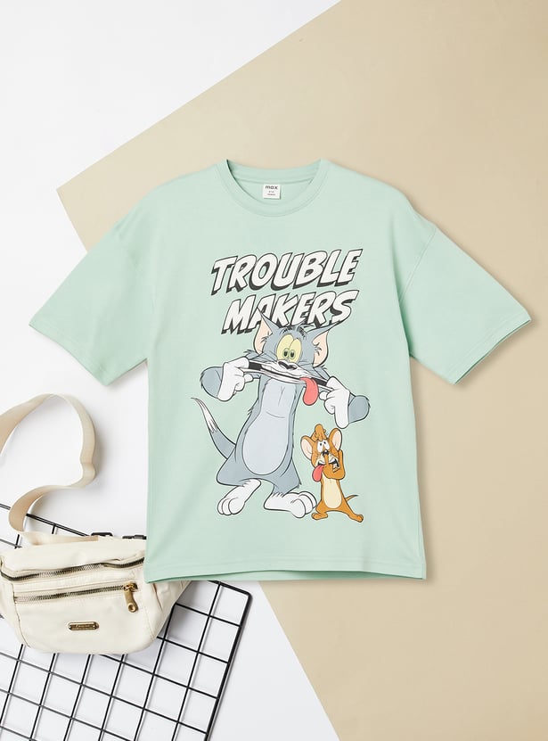 This Tom & Jerry print oversized T-shirt is a playful and relaxed casual piece. Designed with a crew neck and half sleeves, it offers a comfortable fit in a trendy oversized silhouette.