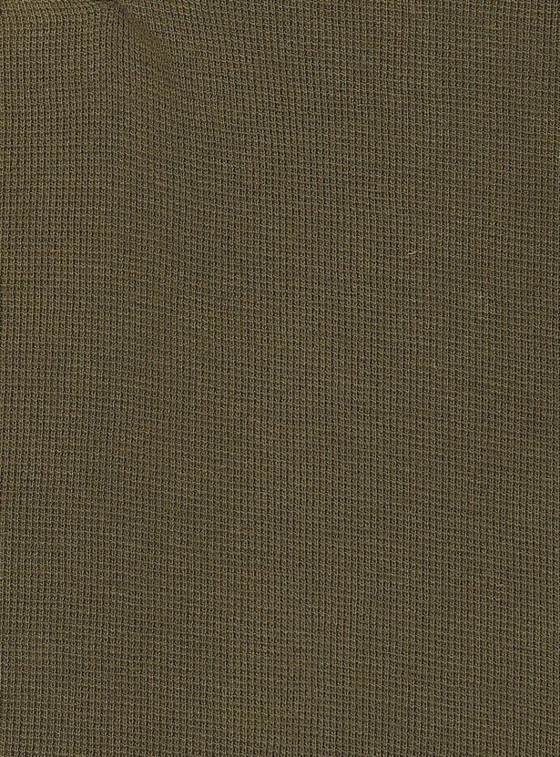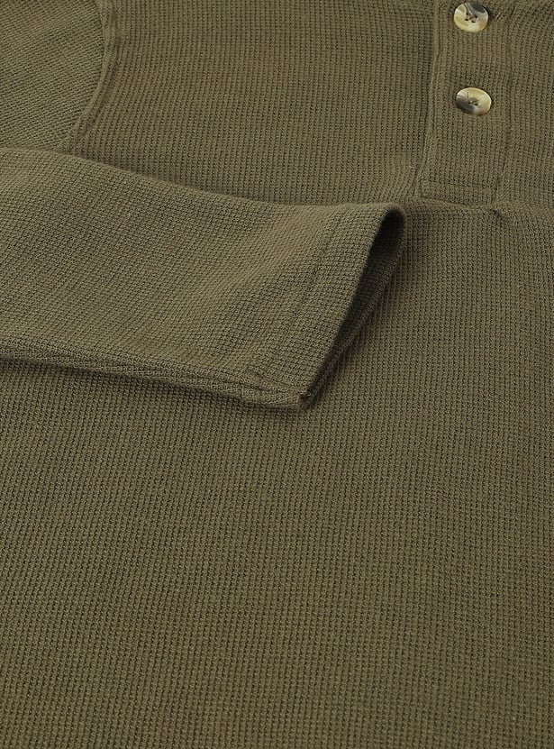 Elevate his casual wardrobe with this waffle knit T-shirt. Featuring a classic Henley neckline and full sleeves, this tee offers both comfort and style. The waffle knit texture adds a unique touch.
