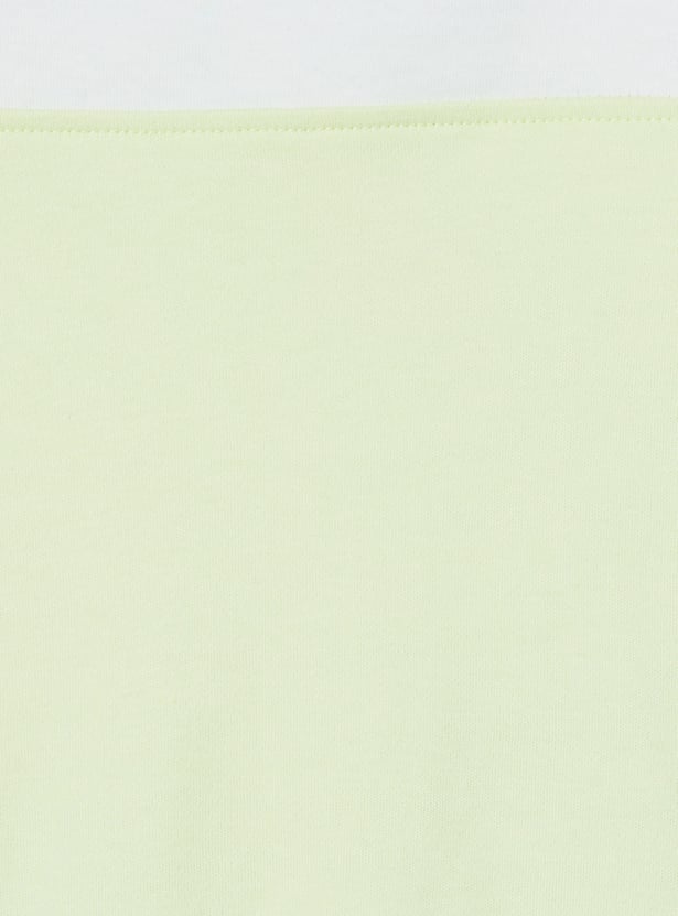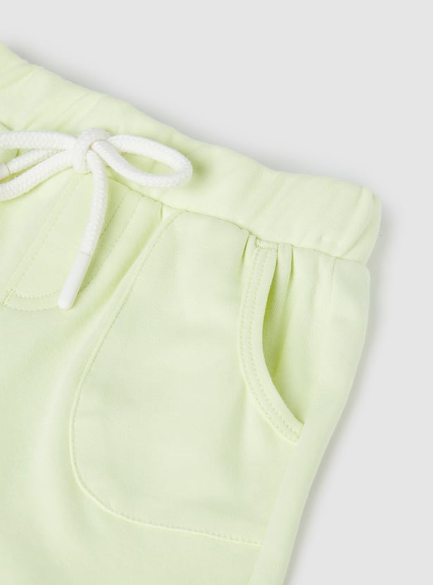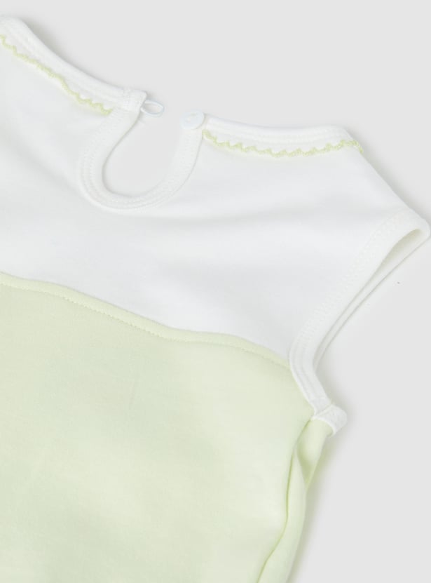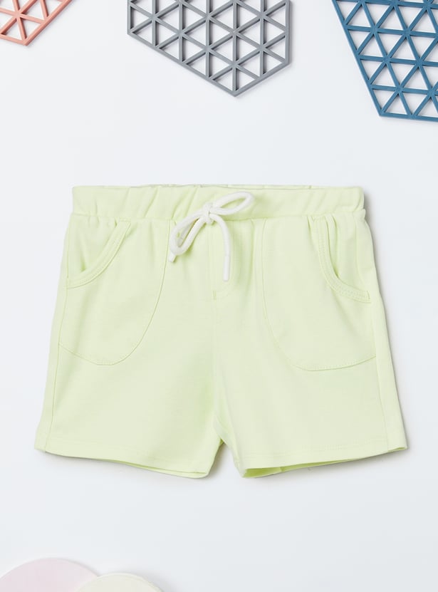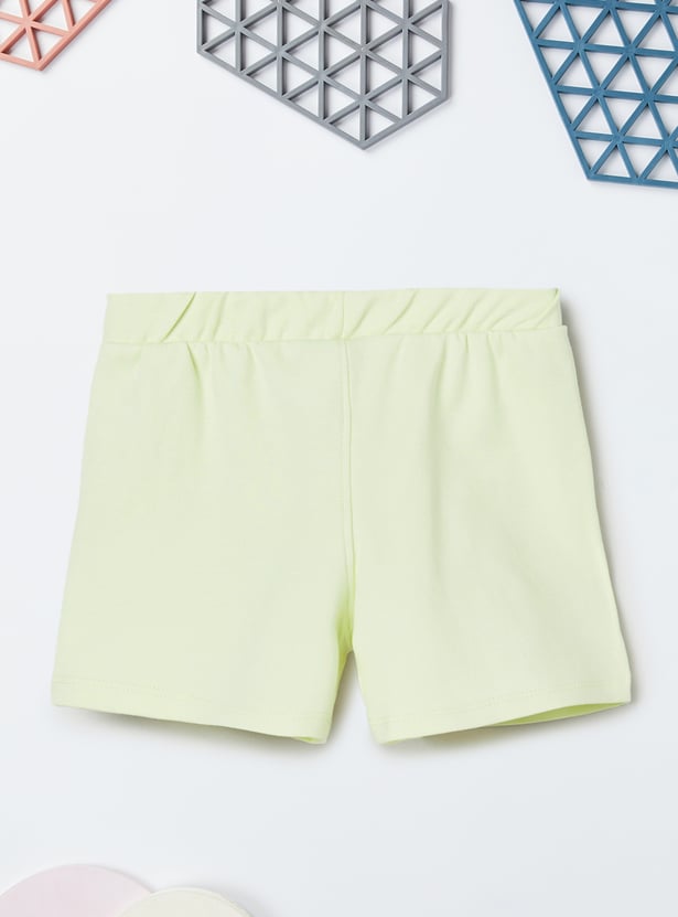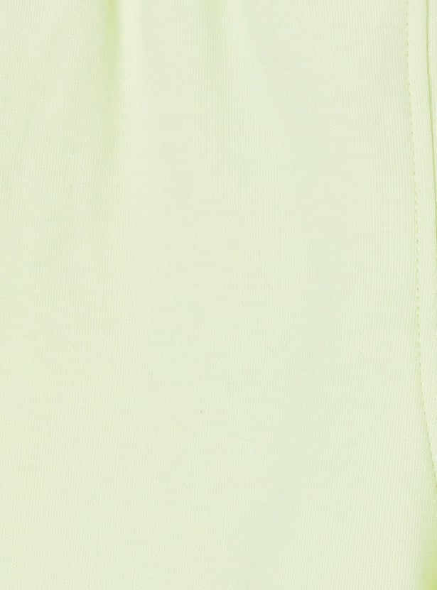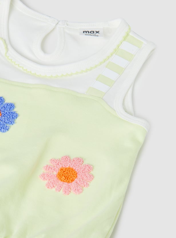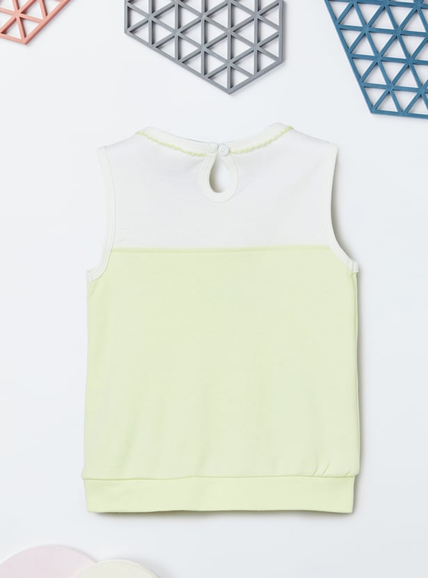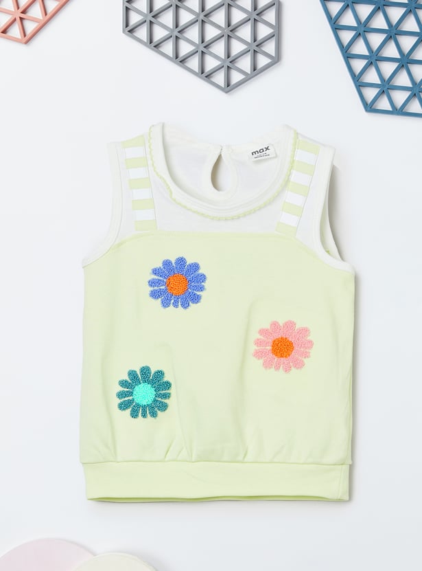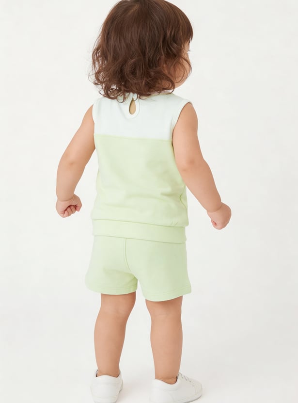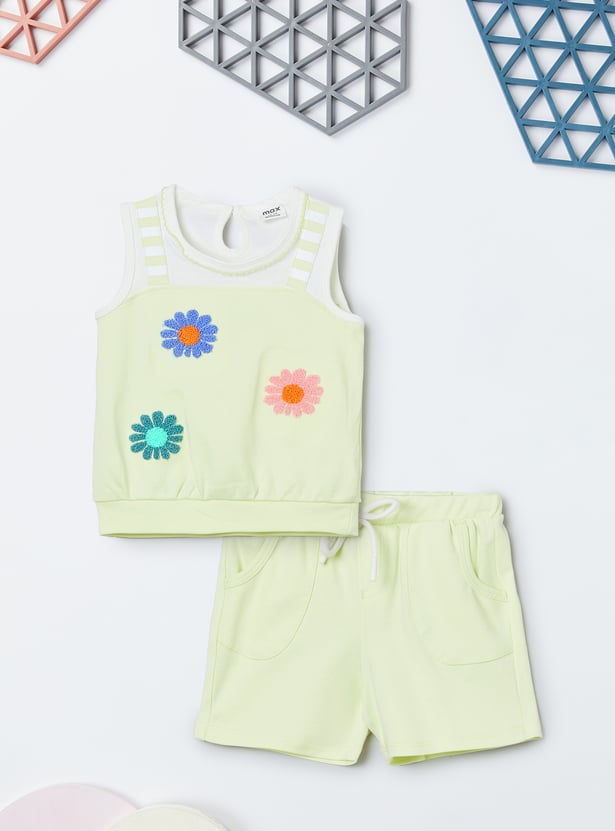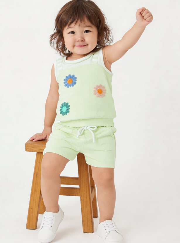 Spruce up your little one's casual wardrobe with the addition of this chenille-embroidered top that features a round neck and no sleeves. It is complemented by a pair of solid elasticated shorts.