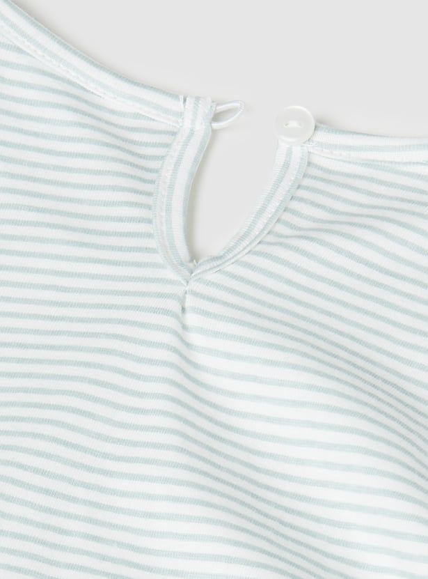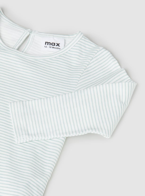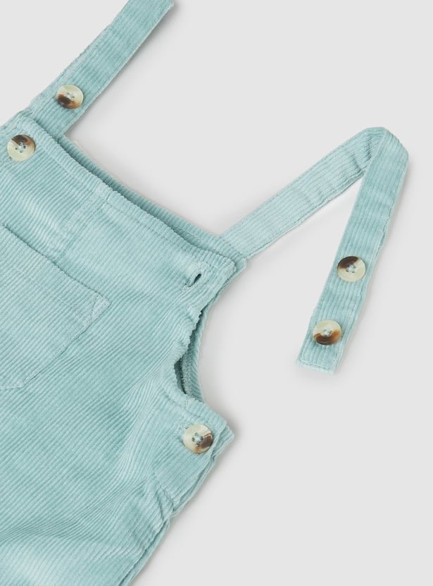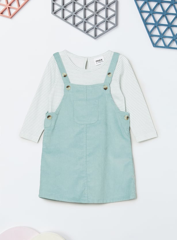 Step out in playful style with this corduroy pinafore dress and t-shirt set. The dress features a square neck, button closure, and straps, paired with a t-shirt that has a round neck and full sleeves for a layered look.