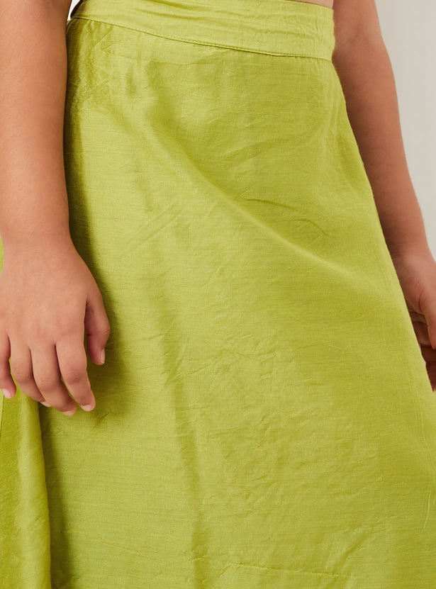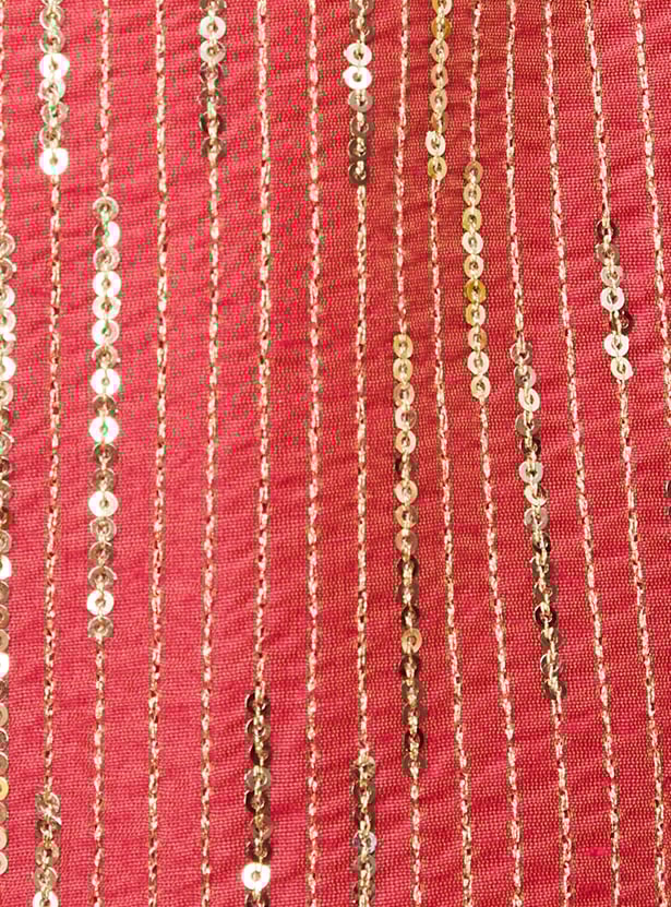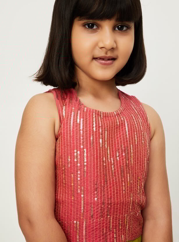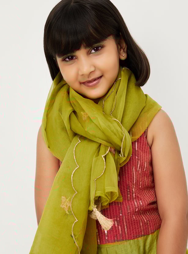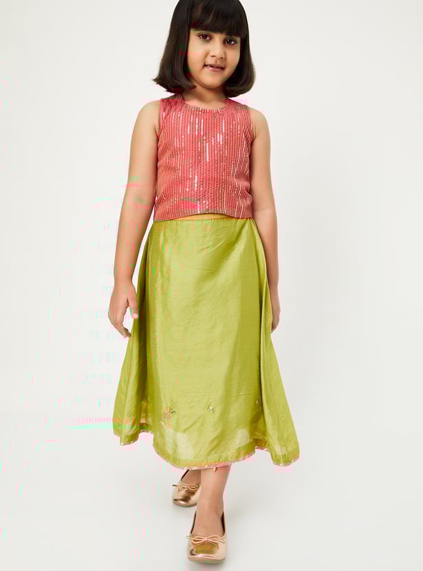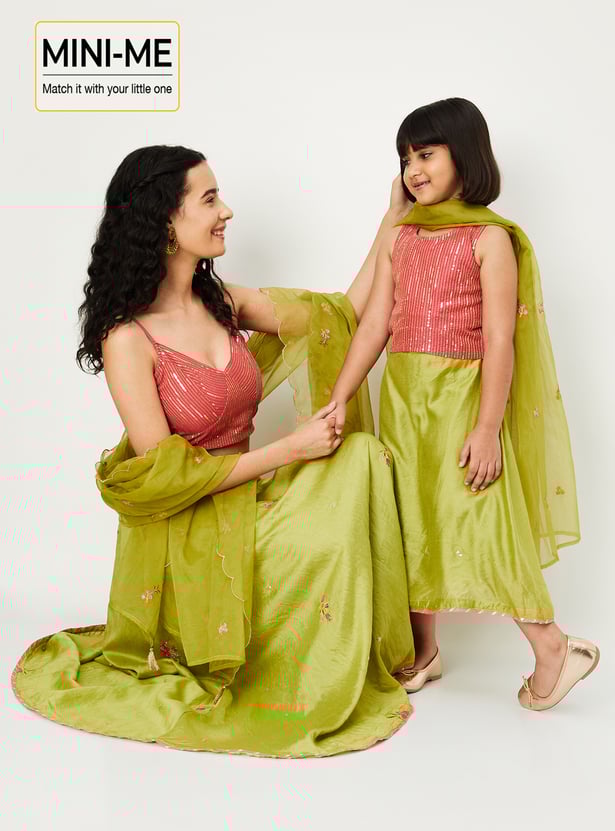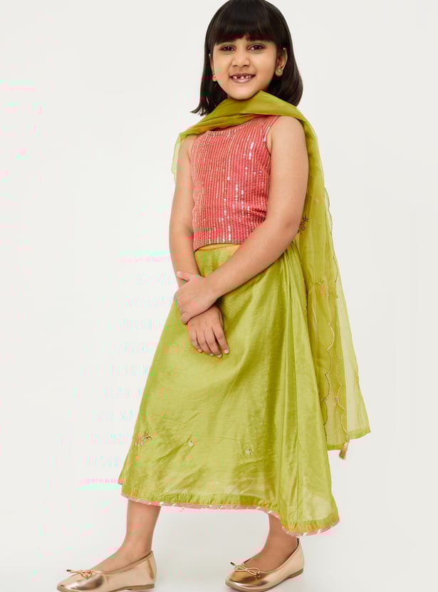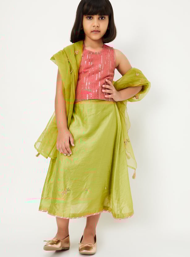 Dress your little diva for occasions and celebrations in this ethnic set. It features a sleeveless blouse with a round neckline and an embellished surface, paired with a solid lehenga and a matching dupatta to complete the ensemble with elegance and charm.