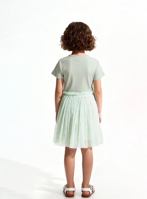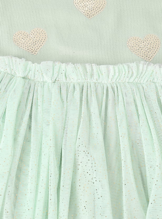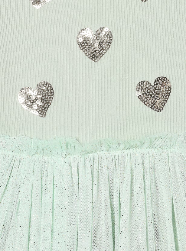 This embellished rib tulle dress features a comfortable bodice with shimmering sequin details and a tulle skirt for a playful, knee-length silhouette. Perfect for casual parties or festive occasions, it adds a touch of sparkle to any wardrobe.