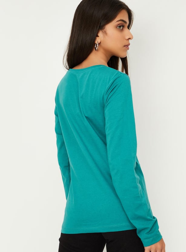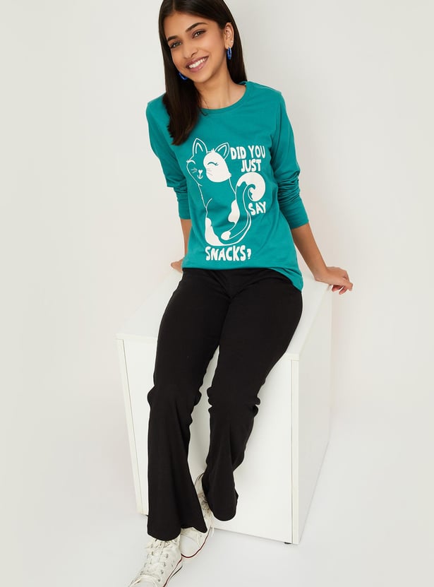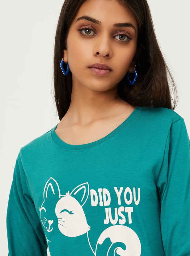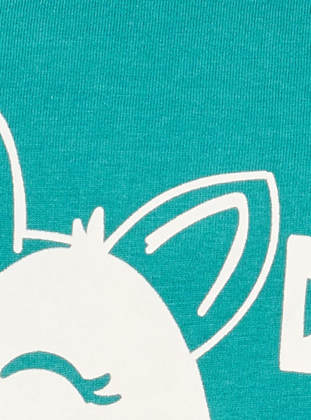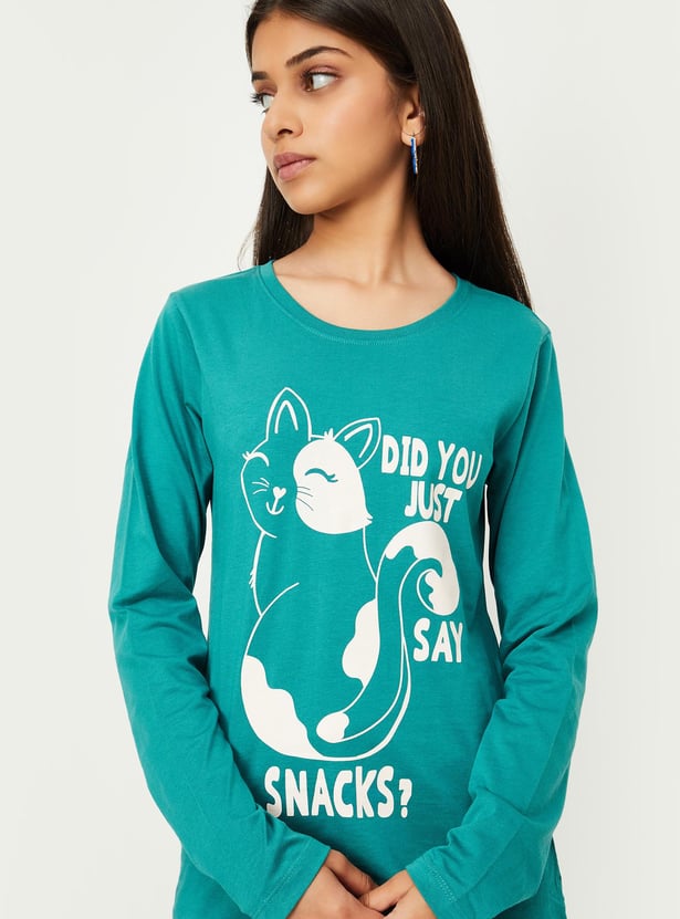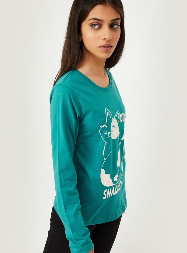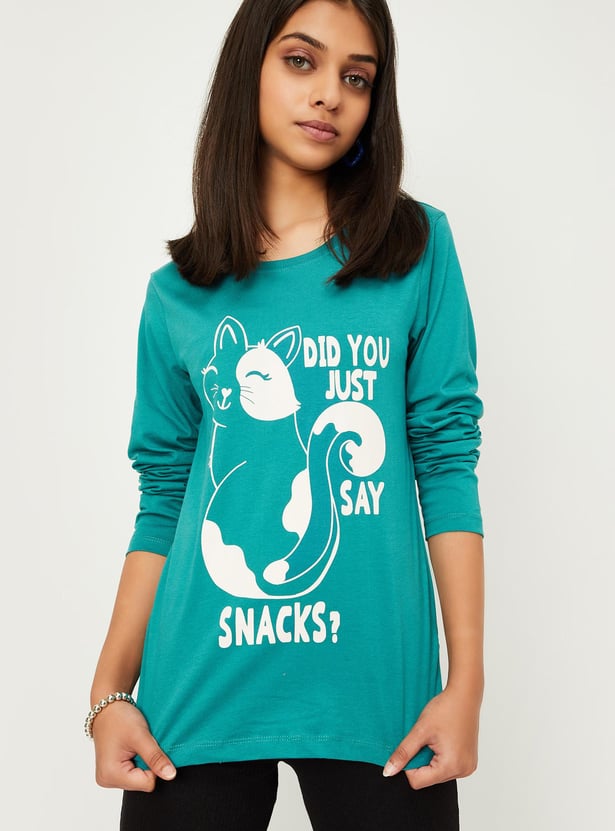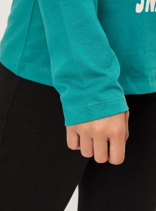Add a fun twist to your kid's casual wardrobe with this T-shirt. It is styled with a graphic print, a round neck, and full sleeves. Style this tee with jeans and sneakers to nail the look.