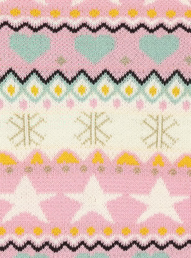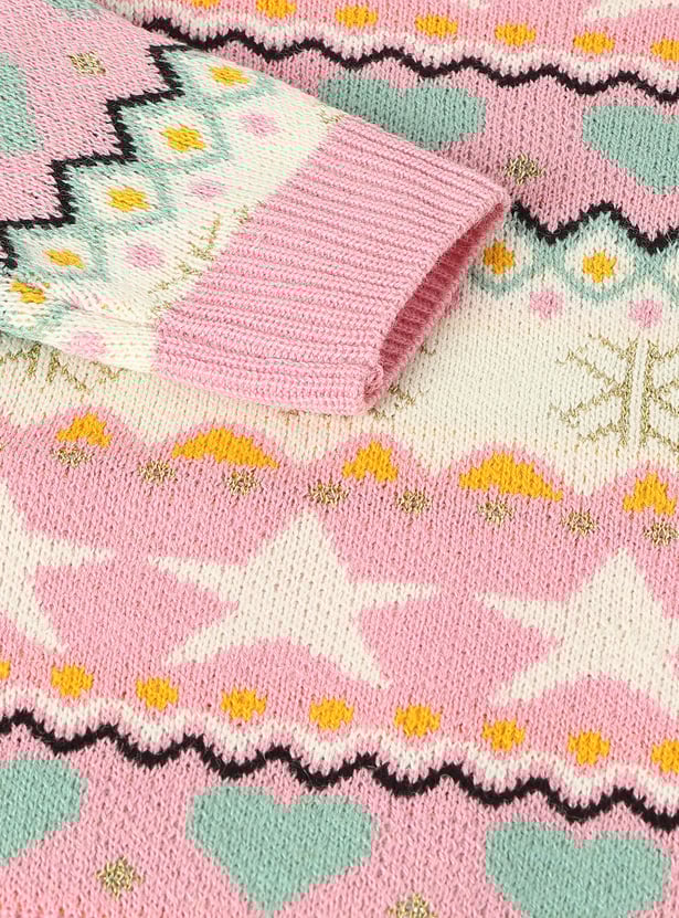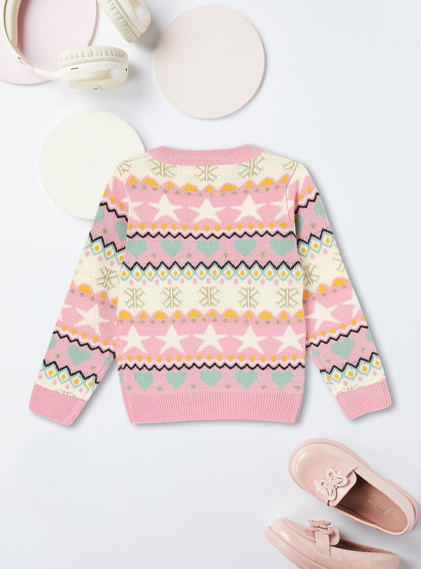 This elegant sweater will keep your kid warm and fashionable throughout winter. It has a knitted pattern, a round neck, full sleeves, and a ribbed hem.