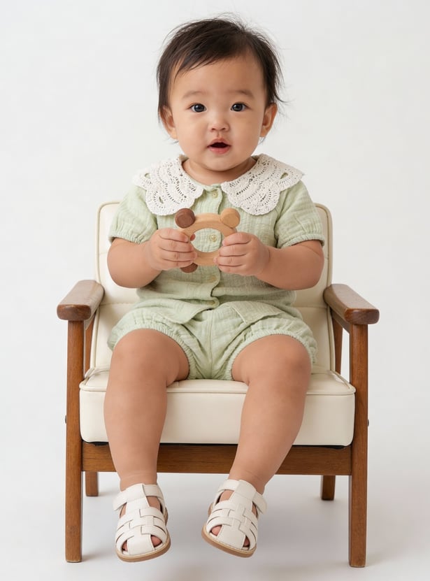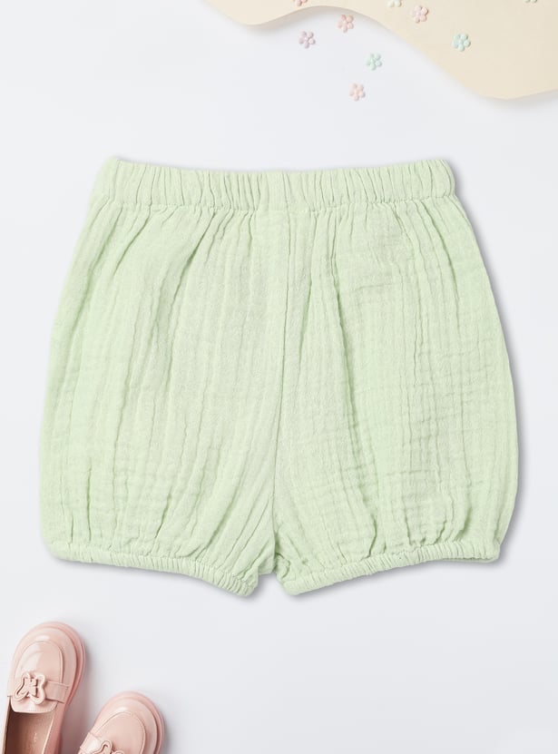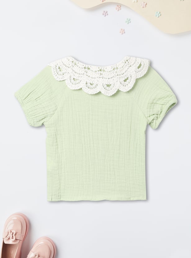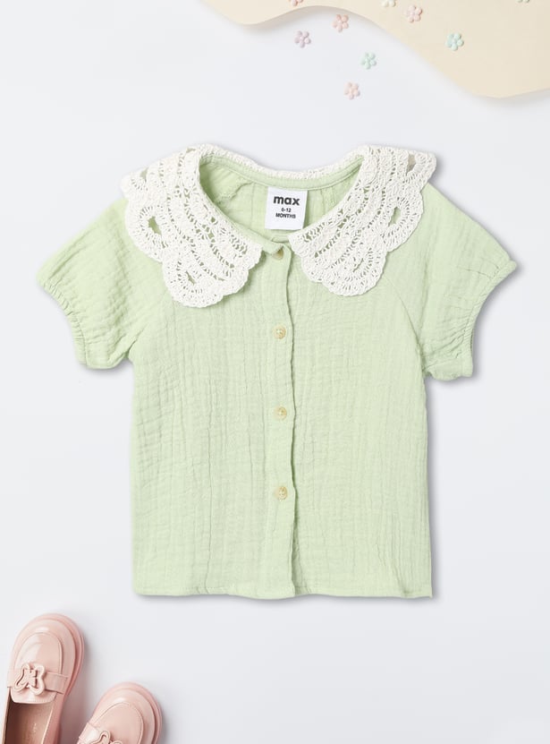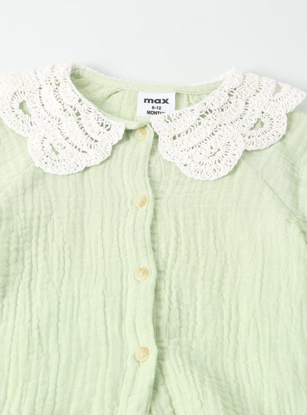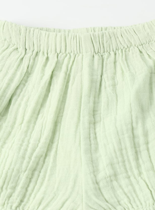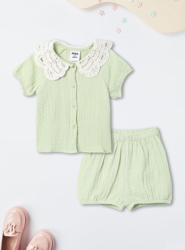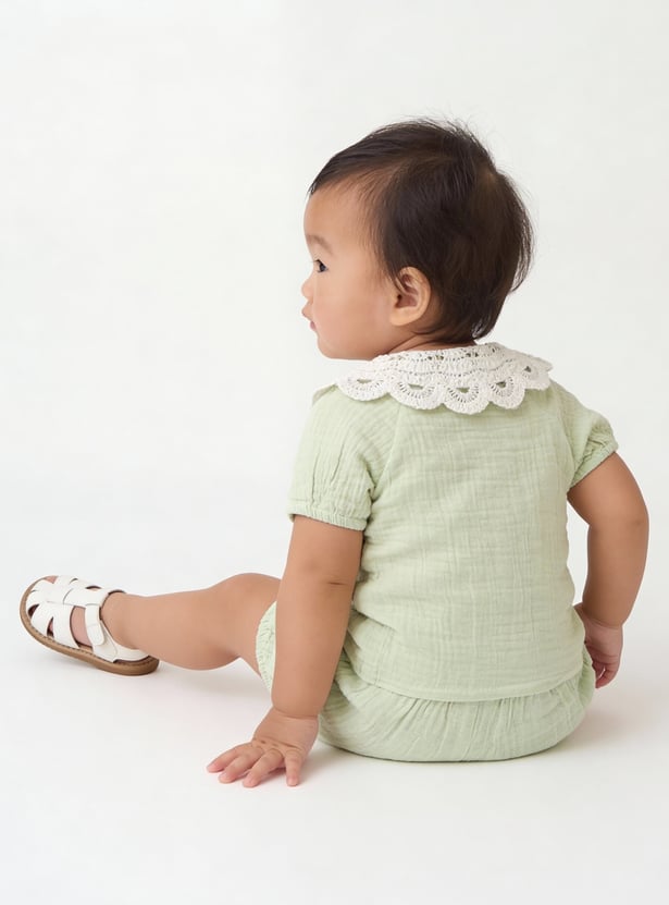 This adorable girls’ shorts set features a lace-collar top, half sleeves, and a button-down closure, paired with matching shorts that have an elasticated waist for a comfortable fit. The coordinated design blends charm and ease, making it perfect for playdates or outings.