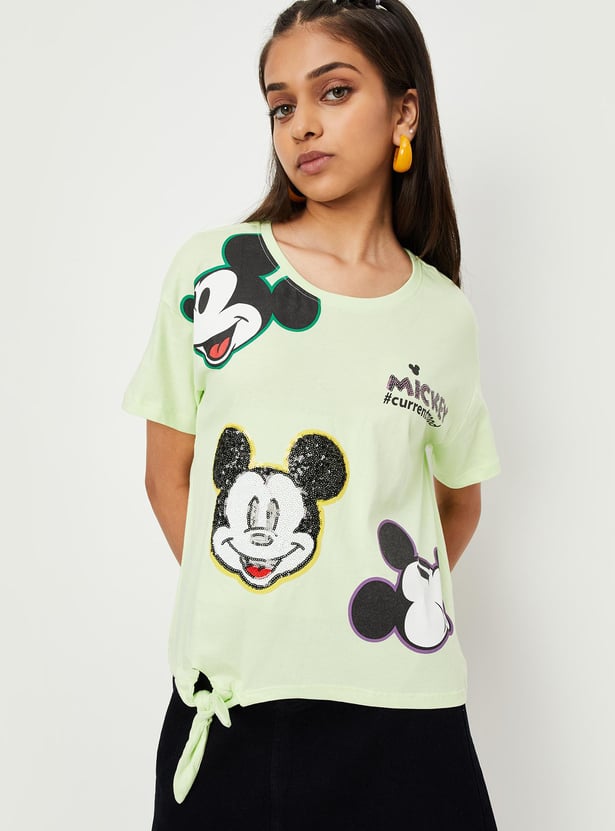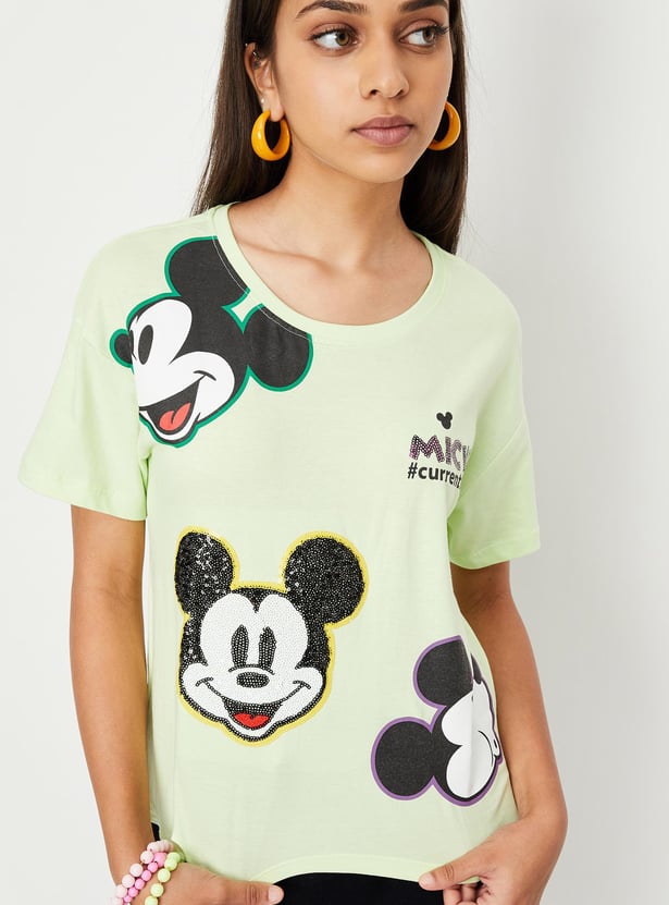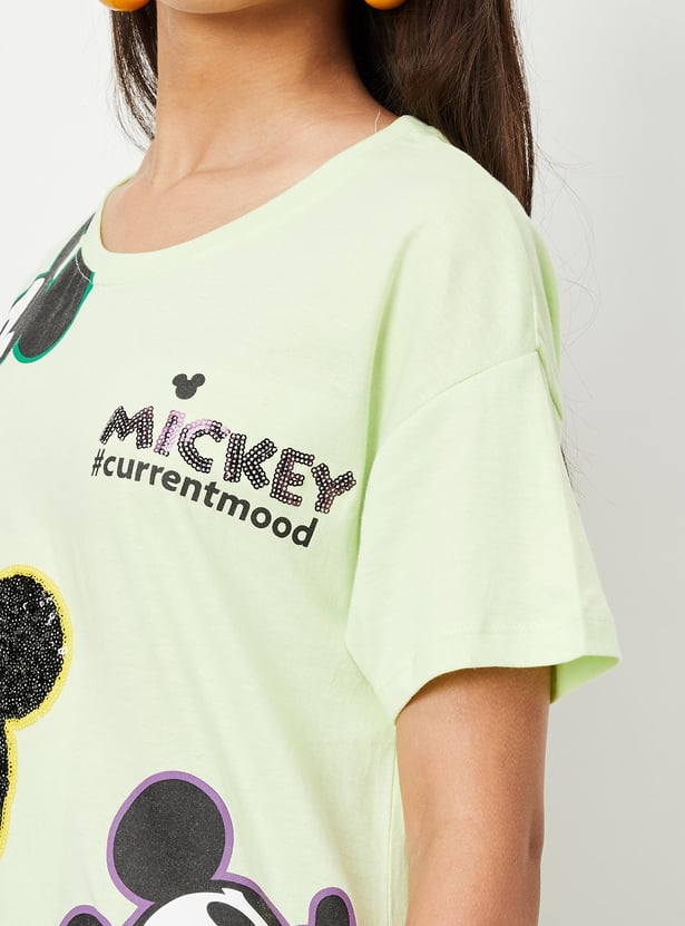 This kid's t-shirt is accentuated by a Mickey Mouse print along with sequins, it features a round neck and half sleeves. Team it up with jeans and sneakers for a snazzy look.
