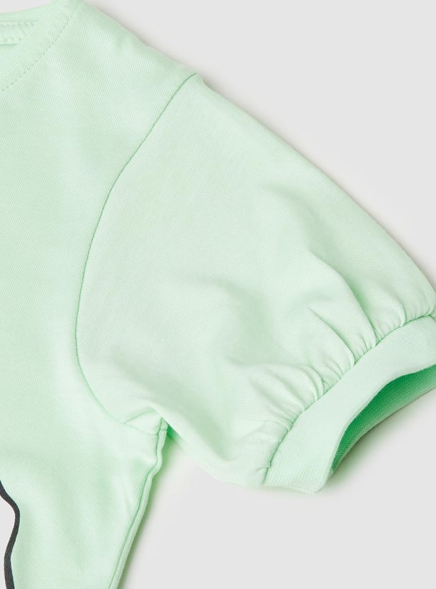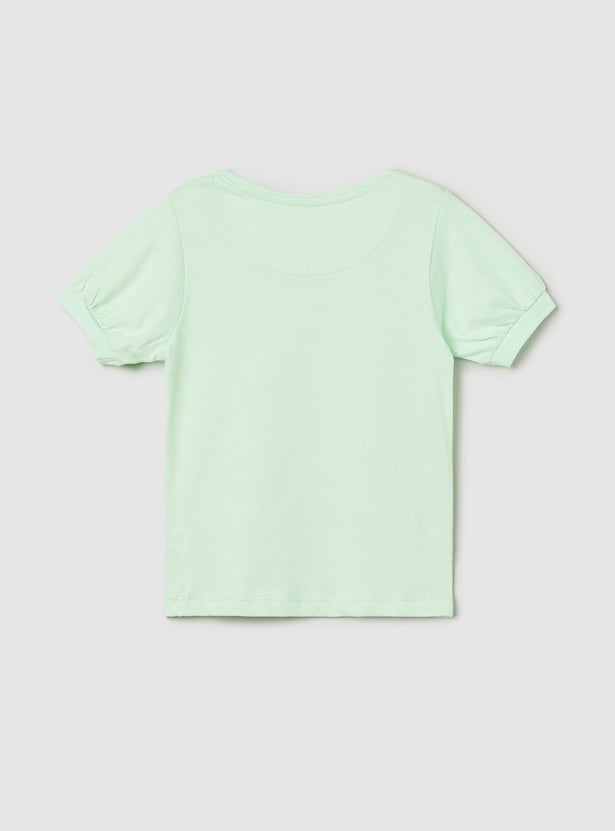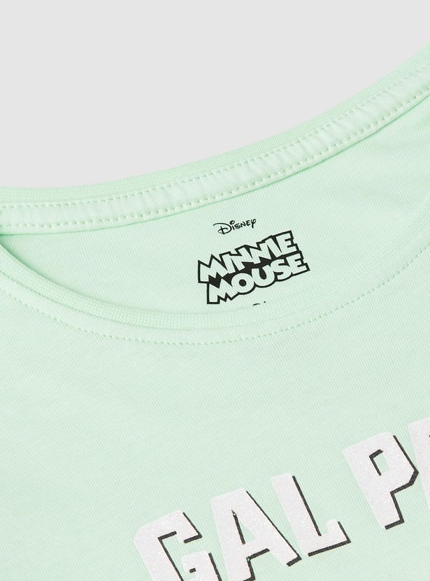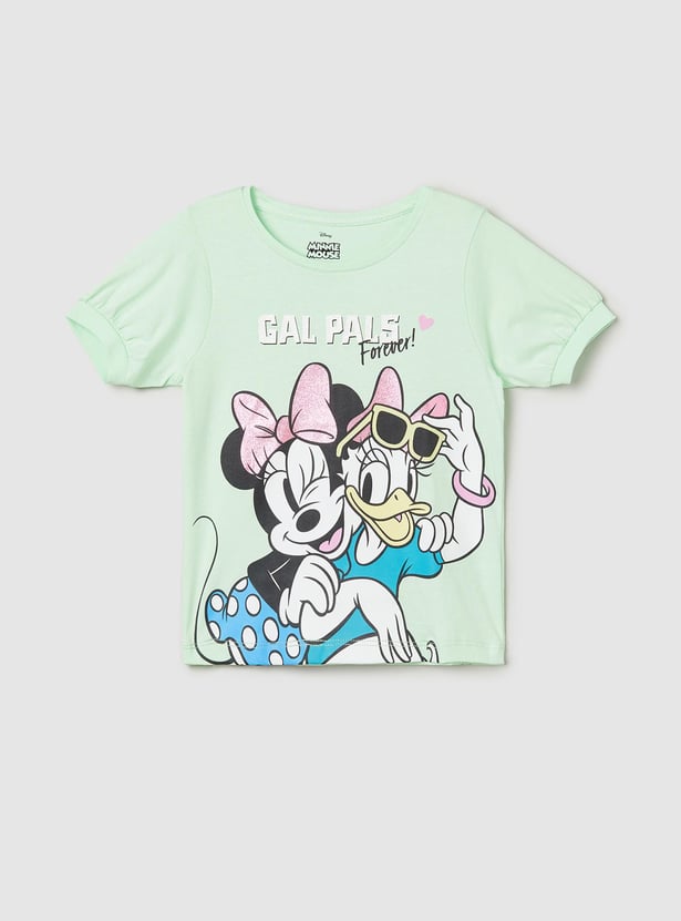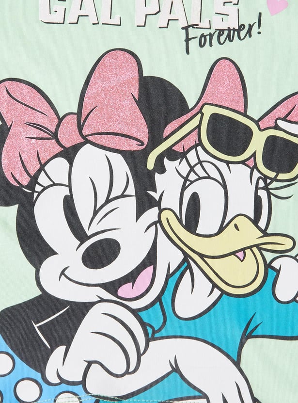 She’ll love to show off her favourite characters with this T-shirt. It features Minnie Mouse and Daisy Duck prints, a round neck, and short sleeves with gathered details and cuffs.