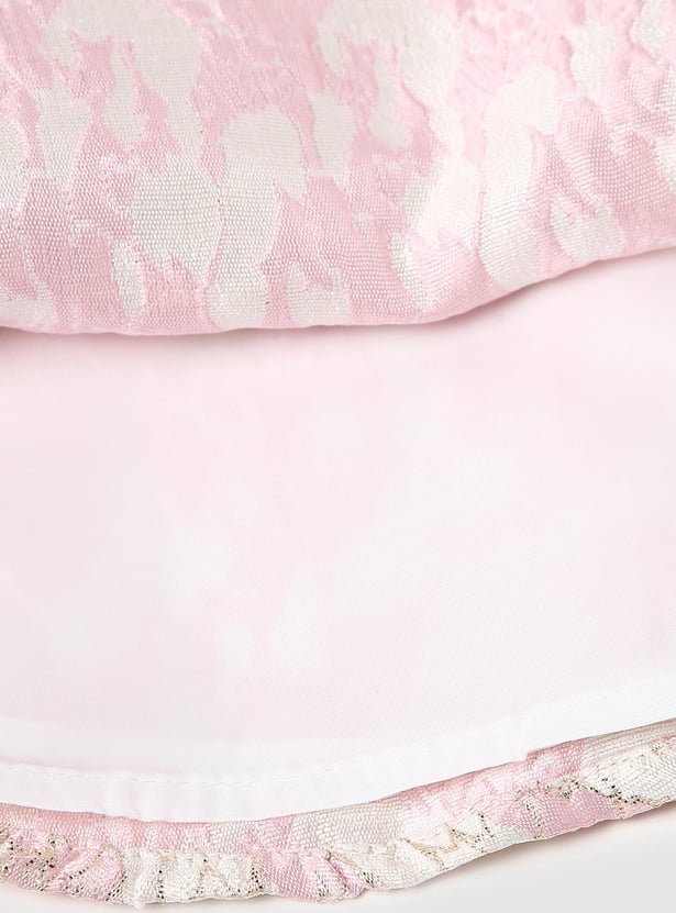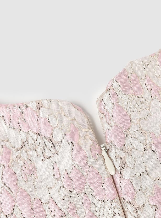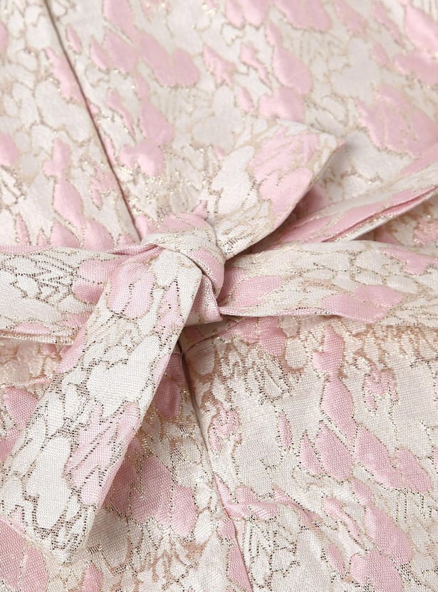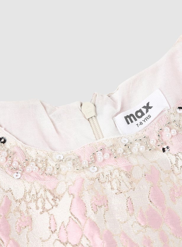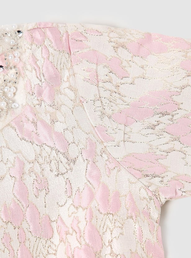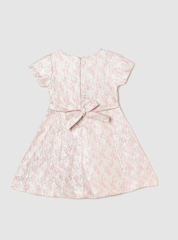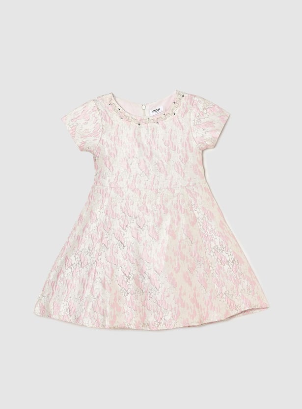 Pretty up her outfit and make her look party-ready with this fit-and-flare dress with an abstract woven pattern. It is fashioned with a round neckline with pearl and sequin embellishments, half sleeves, a tie-up at the back waist, and a curved hem.