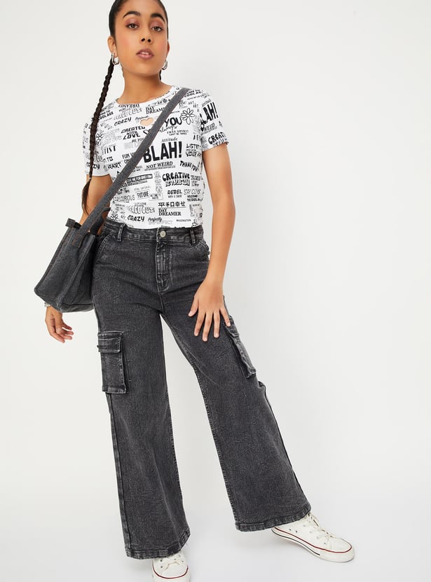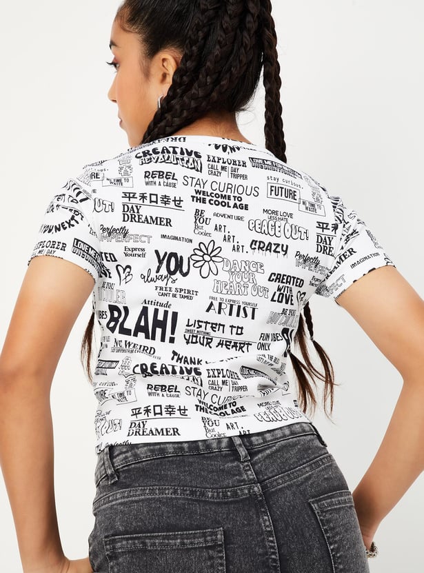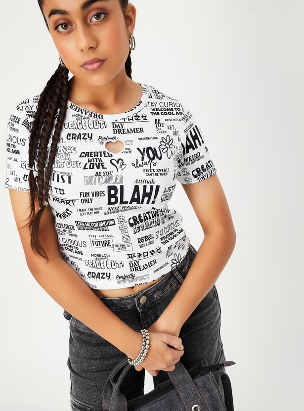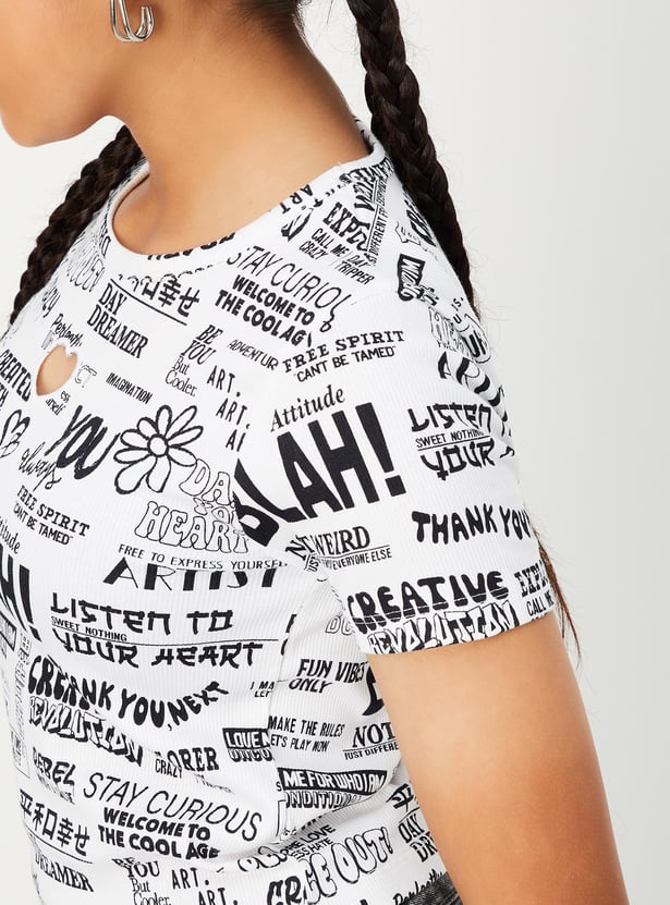 Spruce up your little one's casual wardrobe with the addition of this printed knit top that features a round neck with cutout detail, half sleeves, and a cropped profile.
