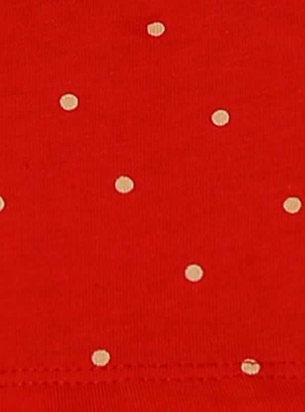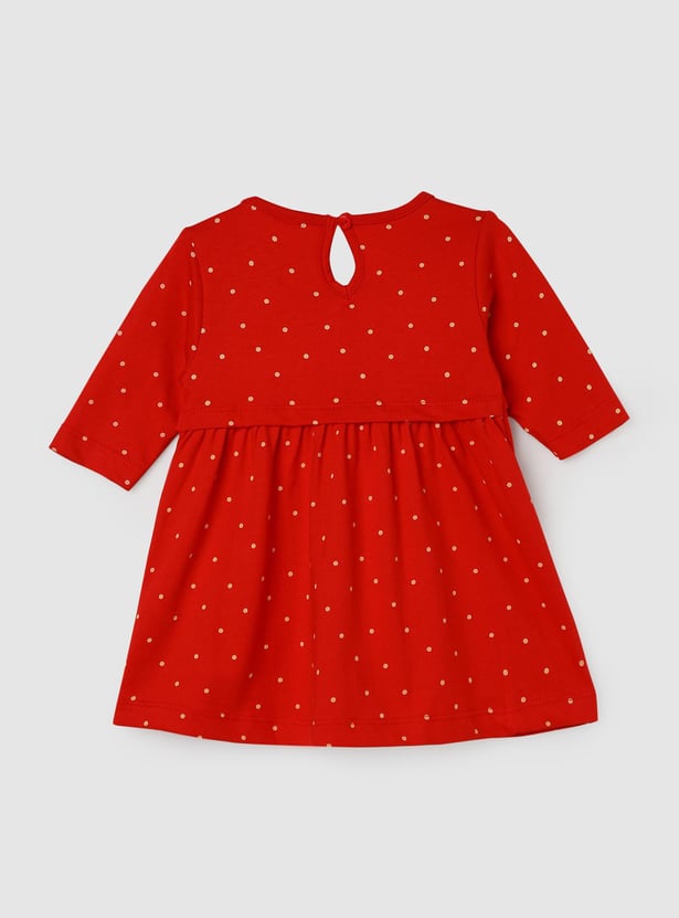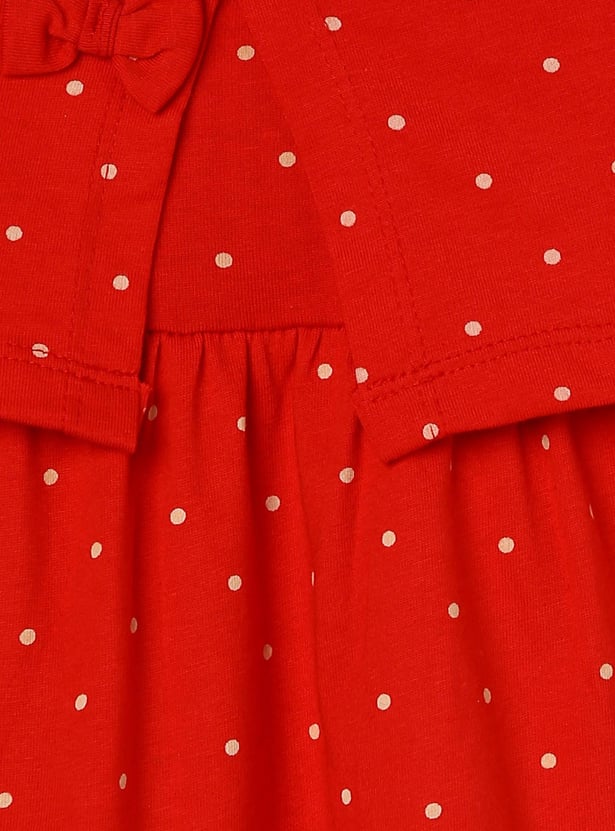 Your kid will have a happier day wearing this printed fit and flare dress. It has a round neckline, full sleeves, and a bow accent.