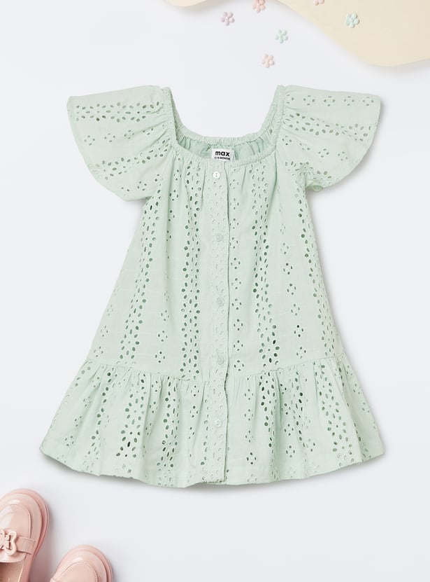 Dress your little one in this charming Schiffli dress, designed with a square neck, half sleeves, and a button front for a stylish, easy-to-wear look. The ruffled hem adds a fun, feminine touch to the dress.