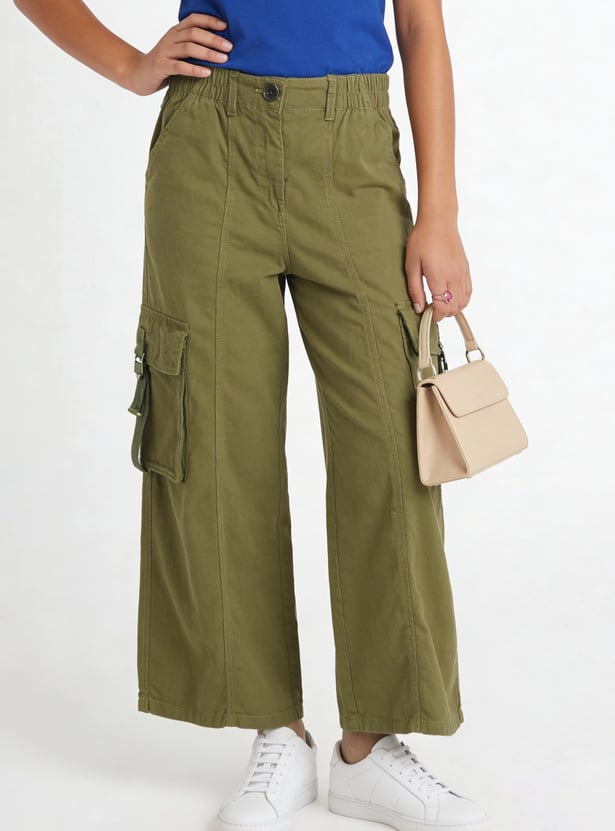 Solid cargo trousers designed with a mid-rise fit, elasticated waist, and secure button closure for all-day comfort. Finished with six functional pockets, they balance practicality with a cool, casual silhouette.