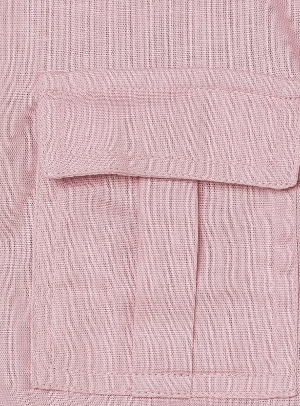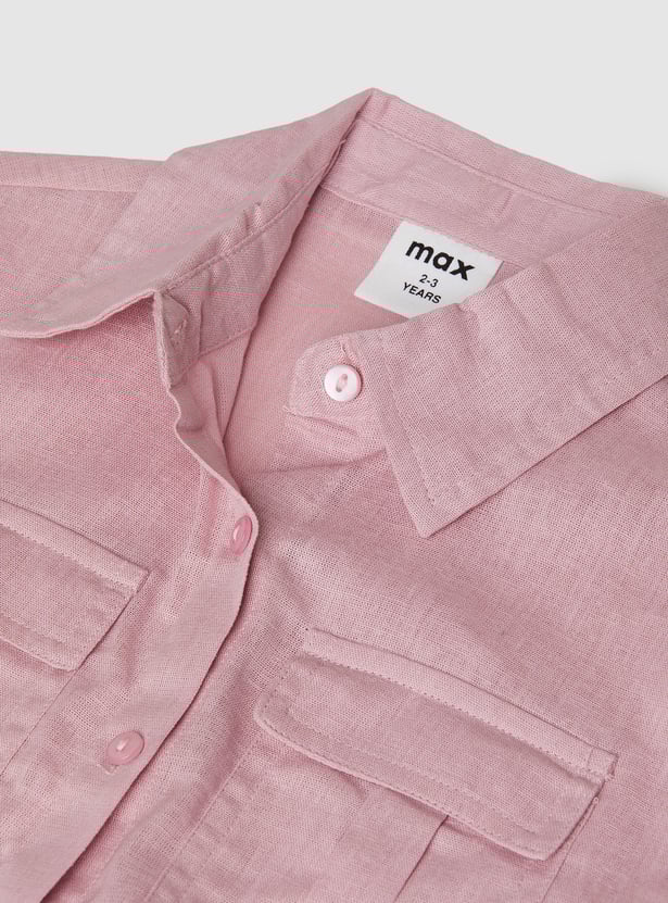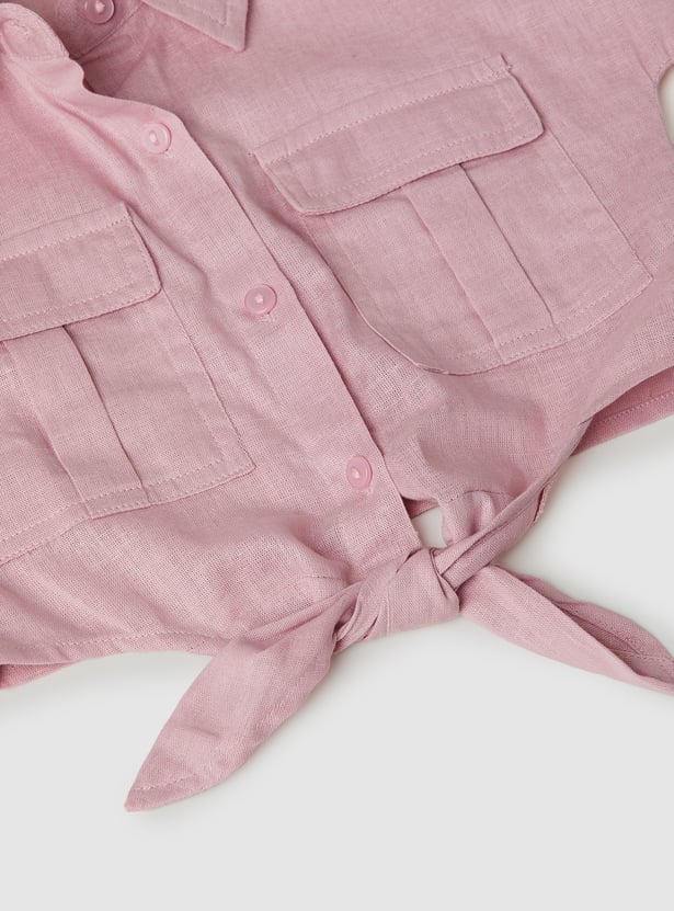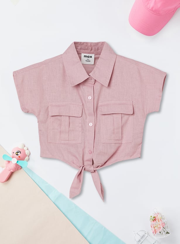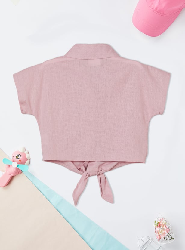 Add some charm to your little one's wardrobe with this solid shirt-style top! Featuring a spread collar, button placket, half sleeves, and a cute tie-up hem, it’s a playful yet stylish choice for everyday wear.