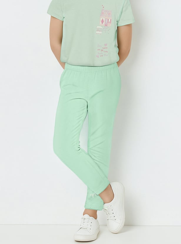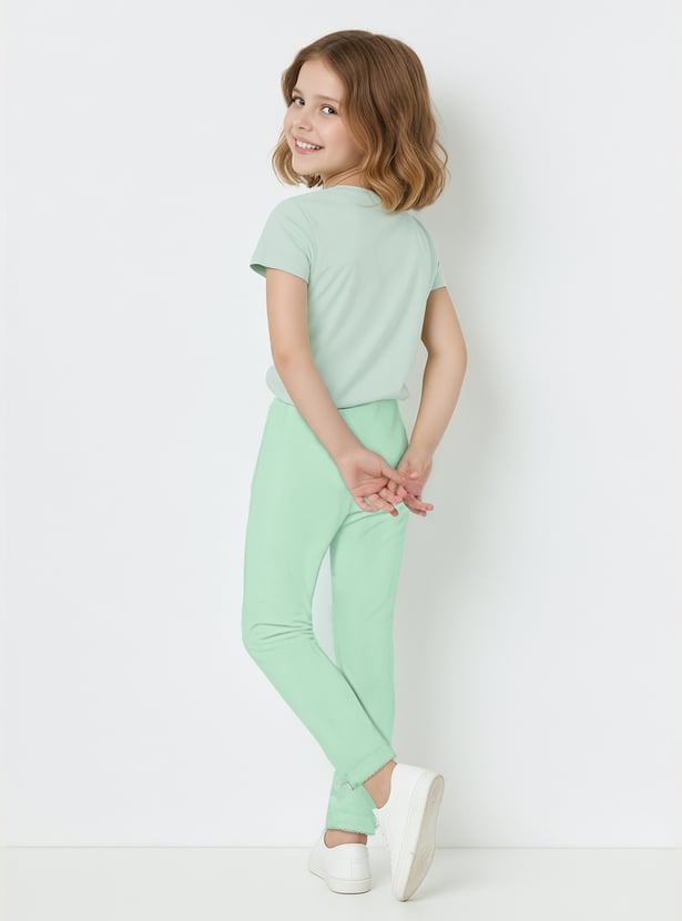 Enjoy all-day comfort with these solid skinny mid rise leggings, featuring an elasticated waist and a charming bow detail at the hem.