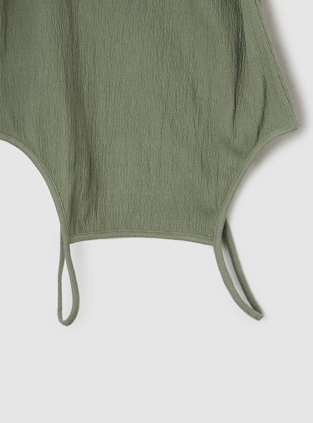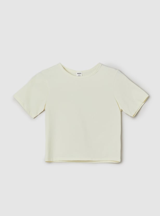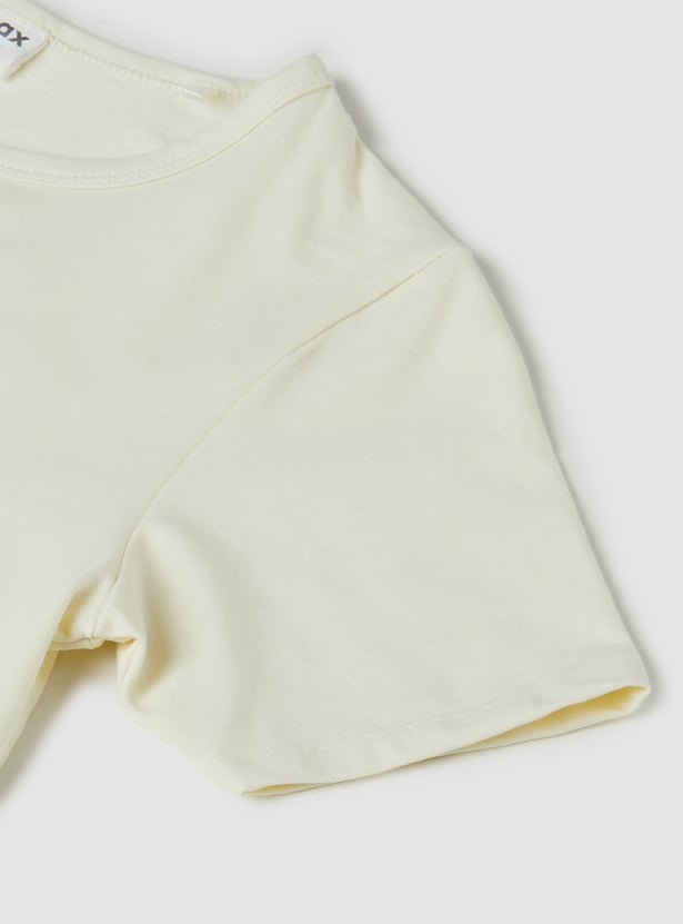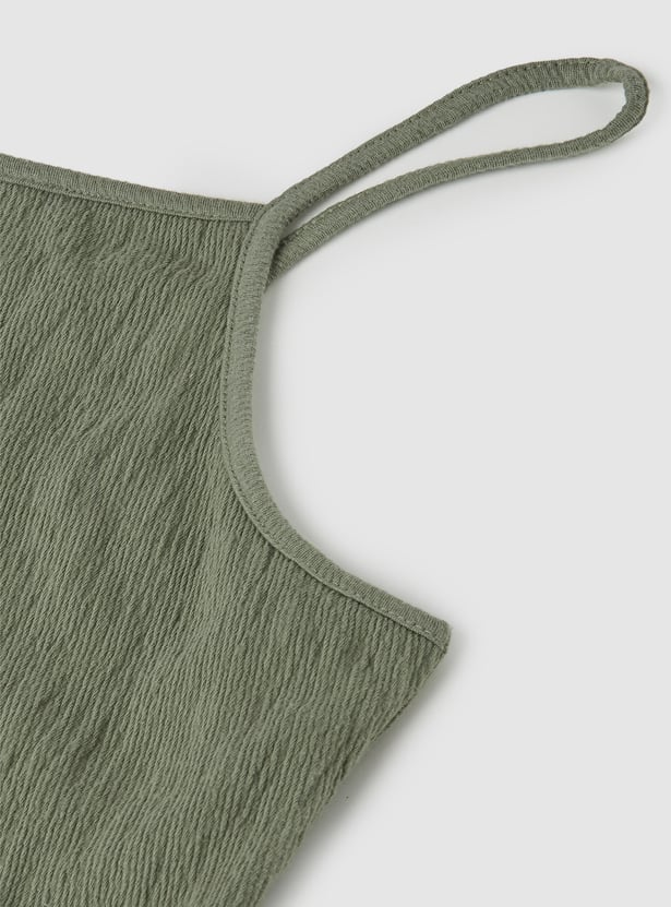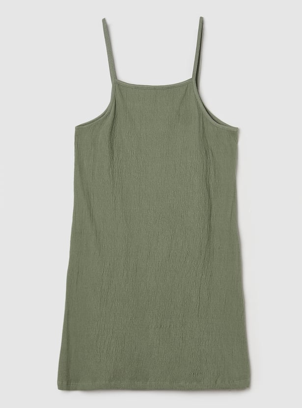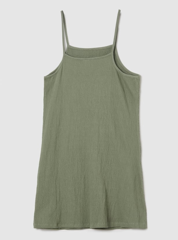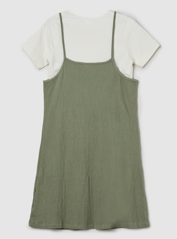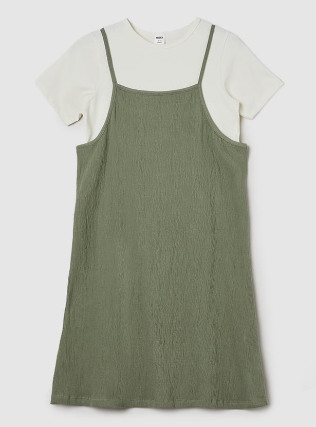 This textured dress with T-shirt combo is a stylish layered look made easy. The dress features spaghetti straps and a round neck, perfectly paired with a classic round-neck, half-sleeve T-shirt for added comfort and contrast.