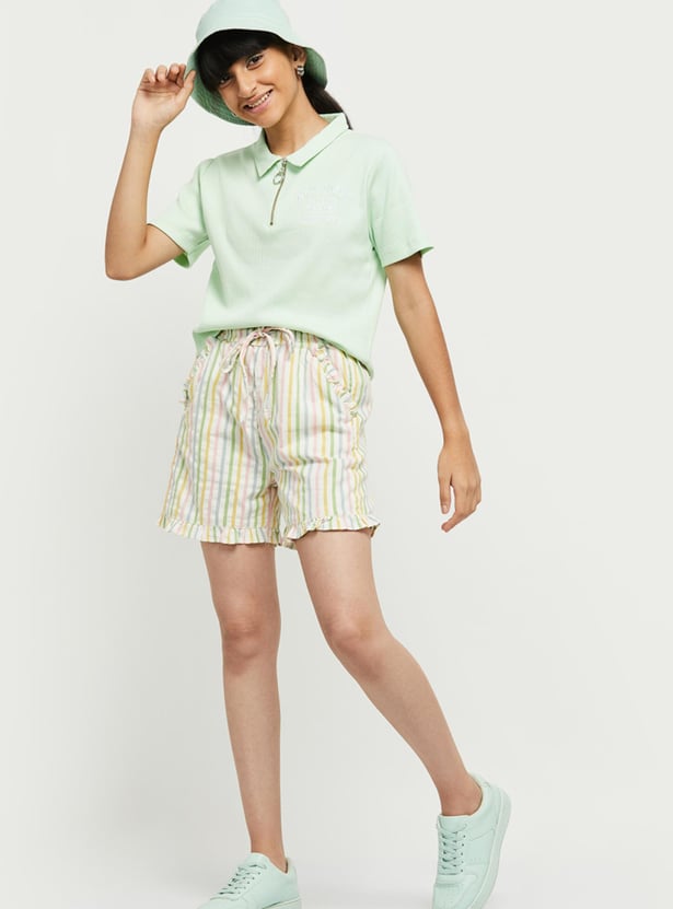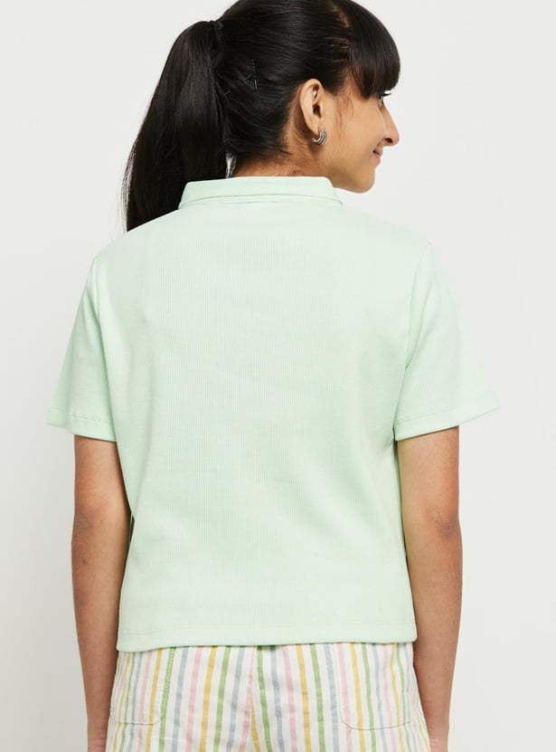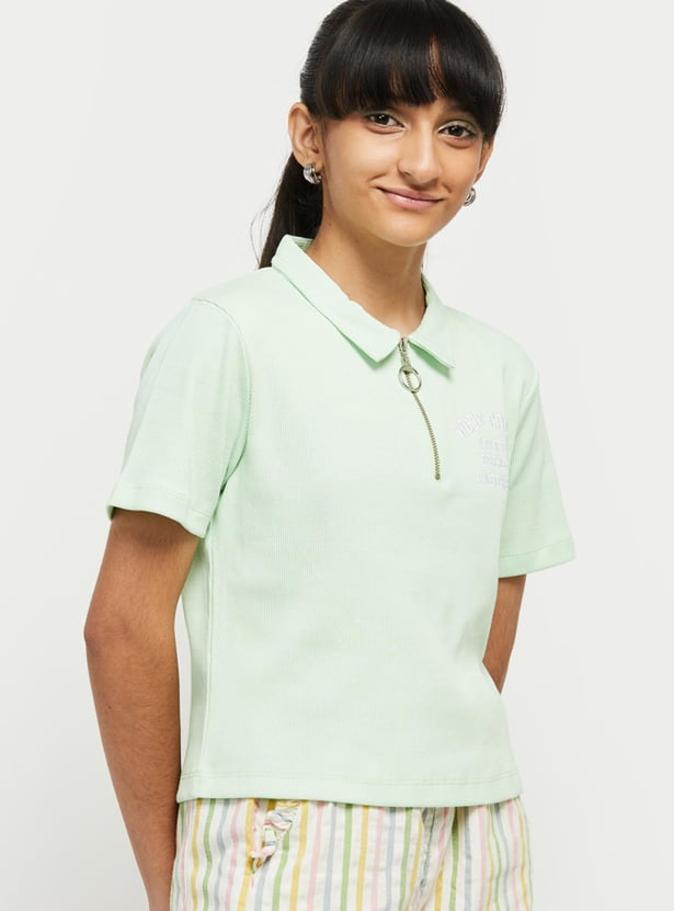 New trends and an updated wardrobe are what can make your child the highlight of any event. Add this polo t-shirt that comes with a textured surface, polo collar, and half sleeves to amp up her casual collection.