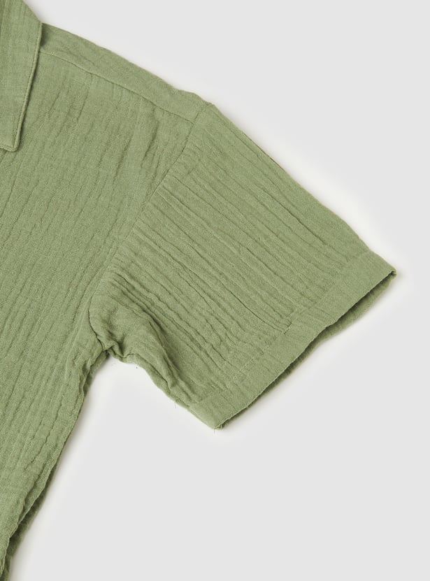 Stay effortlessly cool in this textured shirt, featuring a relaxed Cuban collar, button placket, and half sleeves. Its laid-back vibe and comfortable fit make it a great pick for warm-weather outings or casual get-togethers.