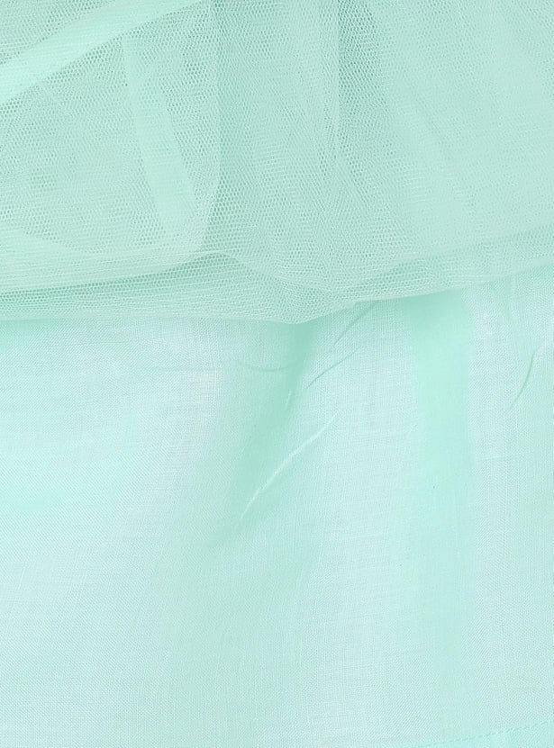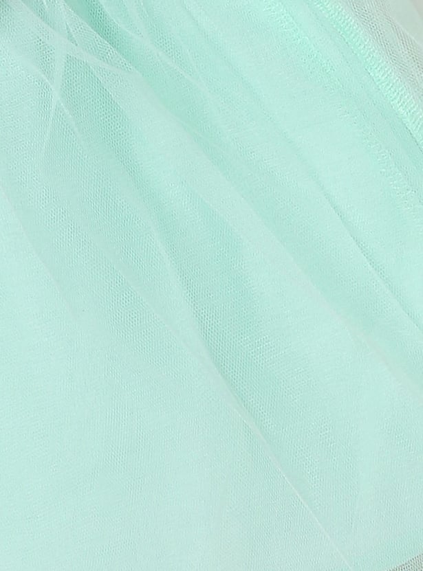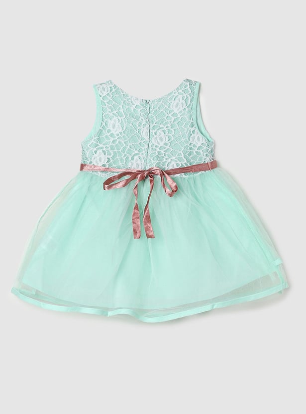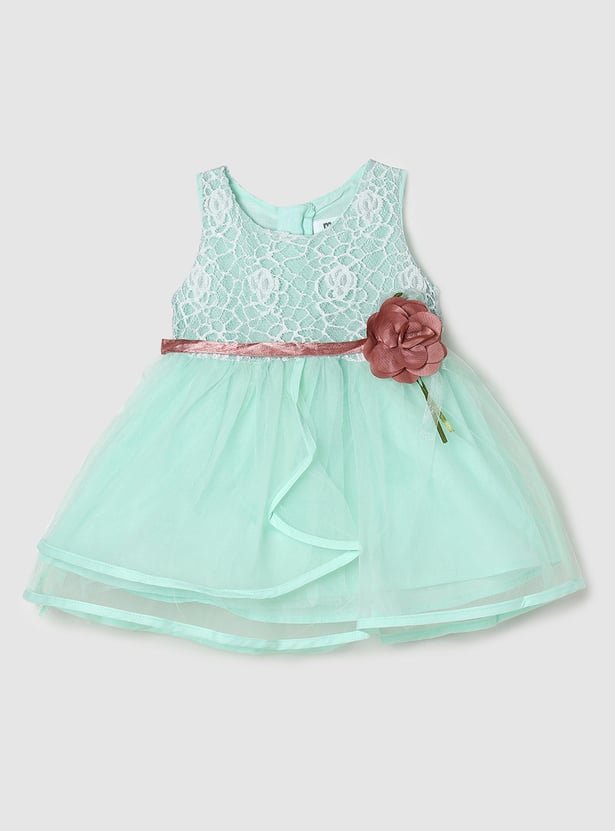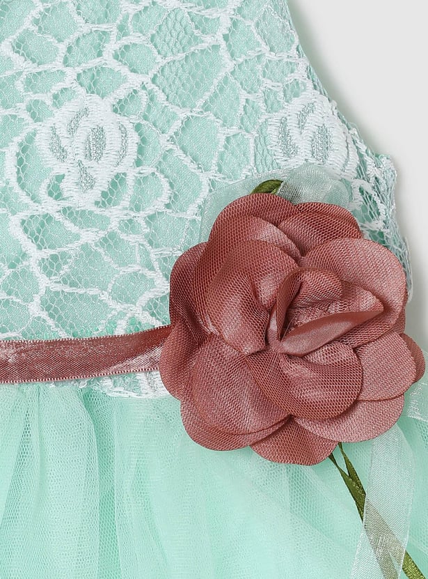 Emphasizing comfort for your little one, this lace detailed dress features a round neckline, floral applique and a waist tie-up detail for extra style.