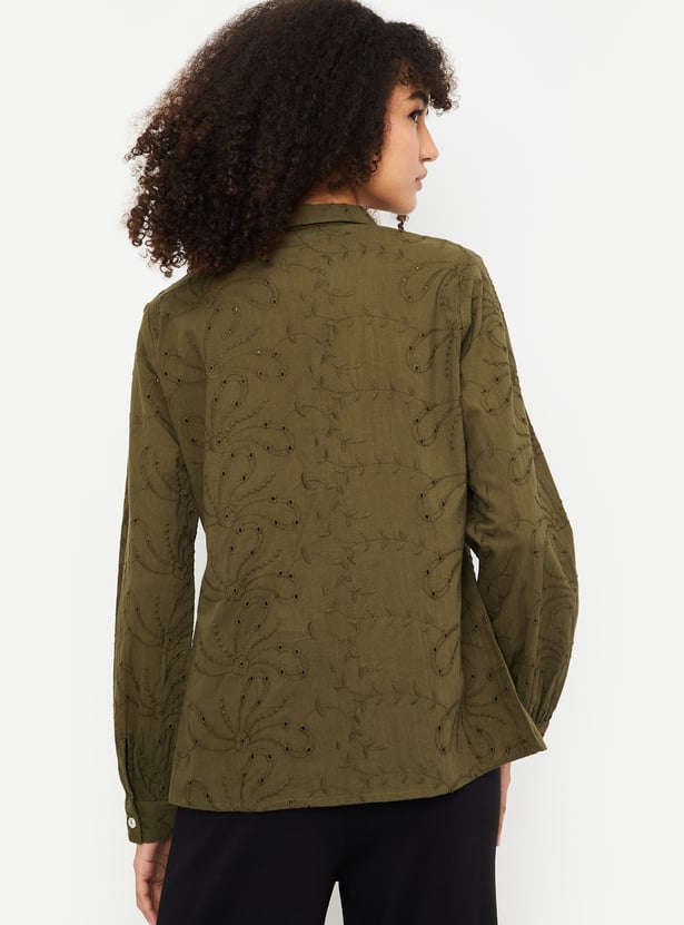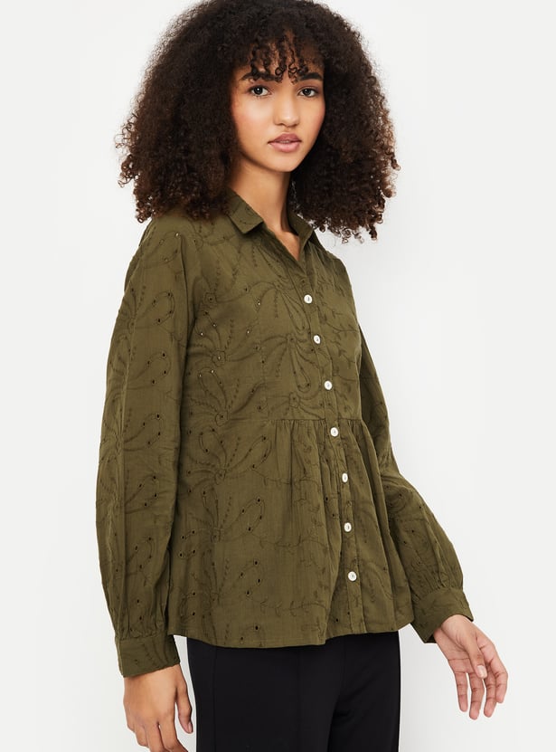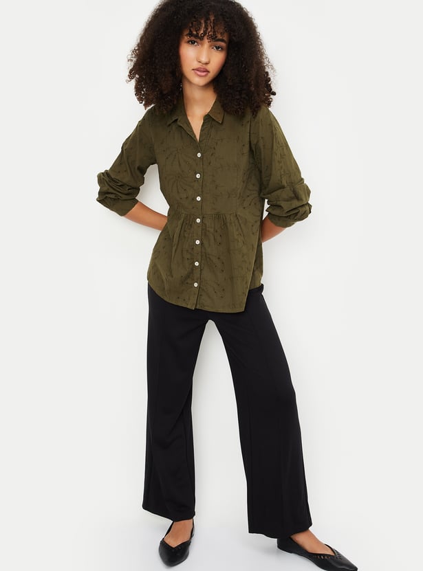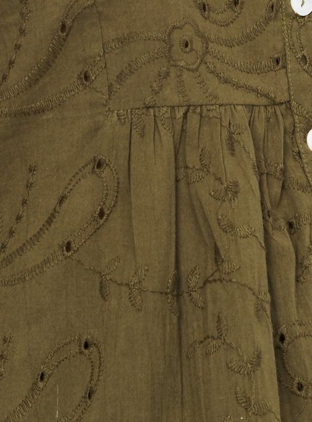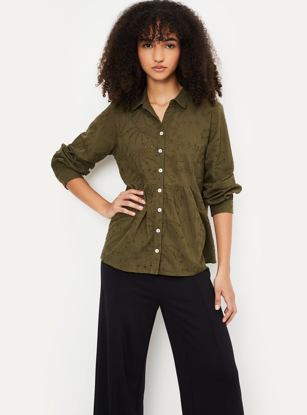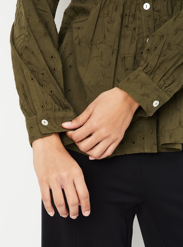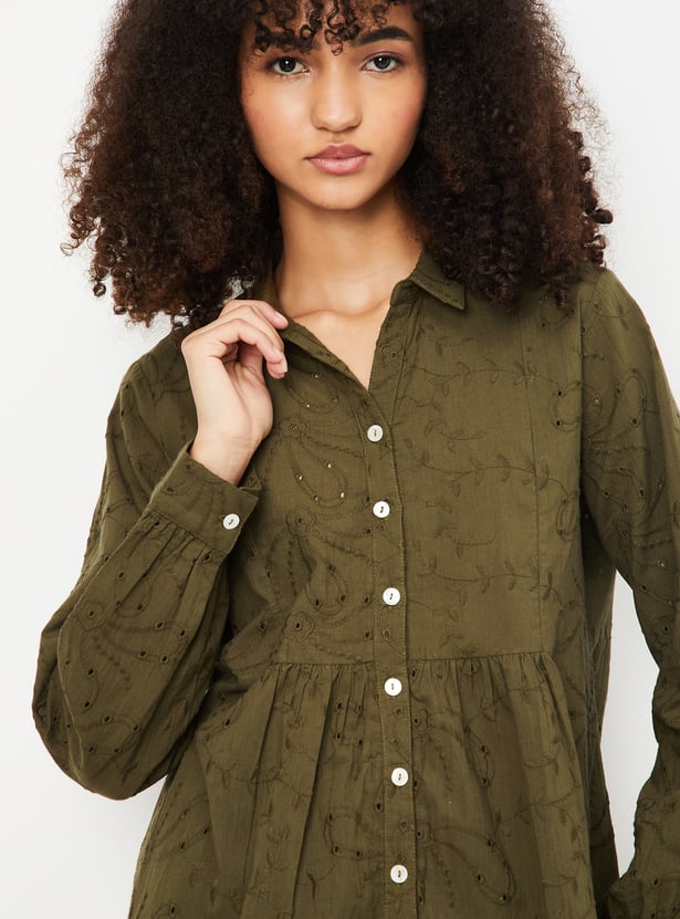 This embroidered tunic exudes elegance with its delicate embroidery and collared design. The 3/4th puff sleeves add a trendy touch, making it perfect for both casual and semi-formal occasions.