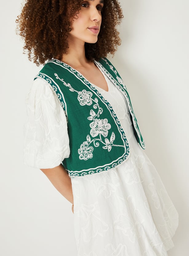 Revamp your style with this embroidered waistcoat. Boasting an open front and a curved hem, it’s ideal for sprucing up your ensemble with a touch of elegance. Perfect for adding a sophisticated layer to any outfit.